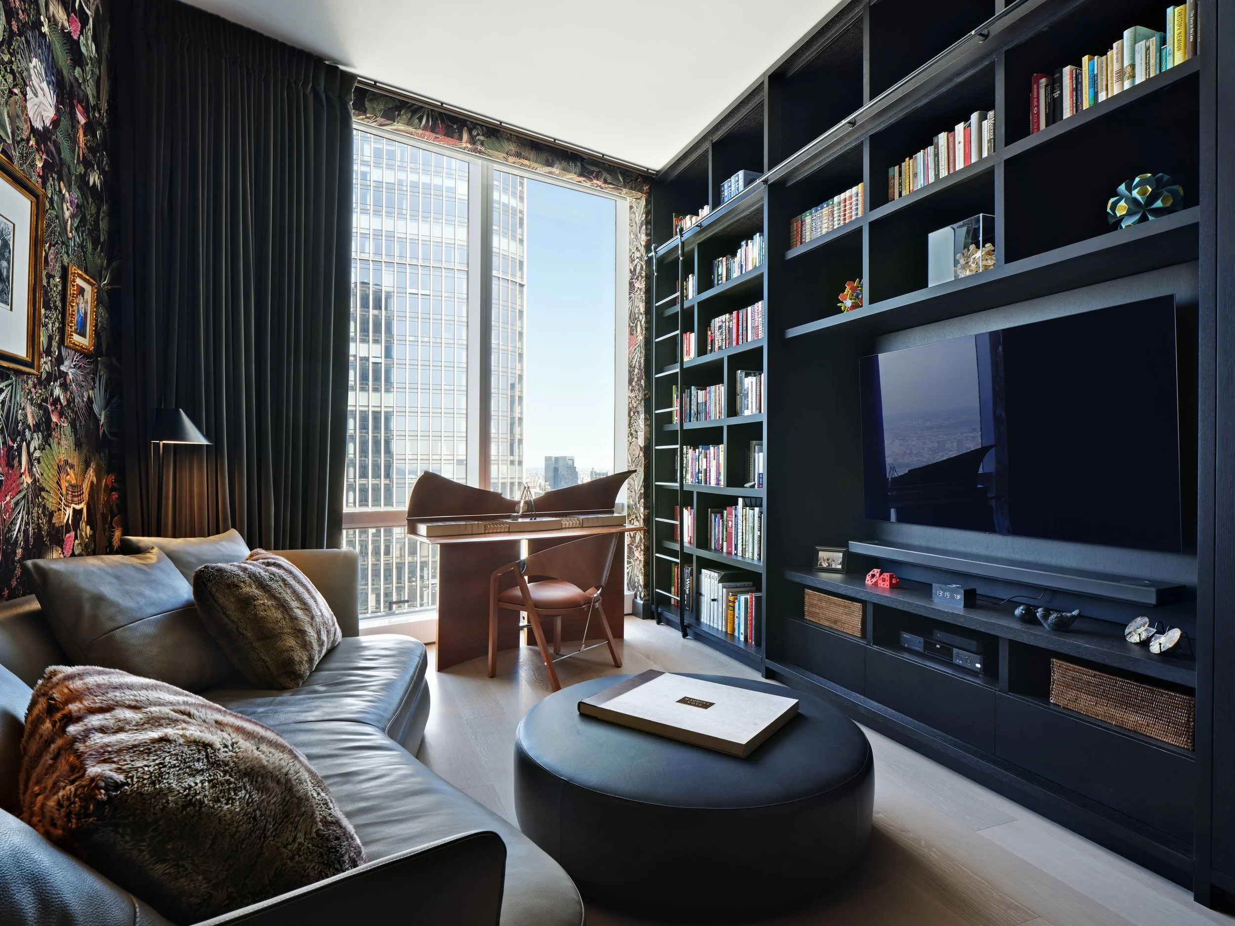 The library has Moooi Menagerie of Extinct Animal wallpaper with a B&B Italia sofa and ottoman. The desk is the Butterfly desk from Tresserra. The custom wall unit is the perfect complement to the dark wallpaper.