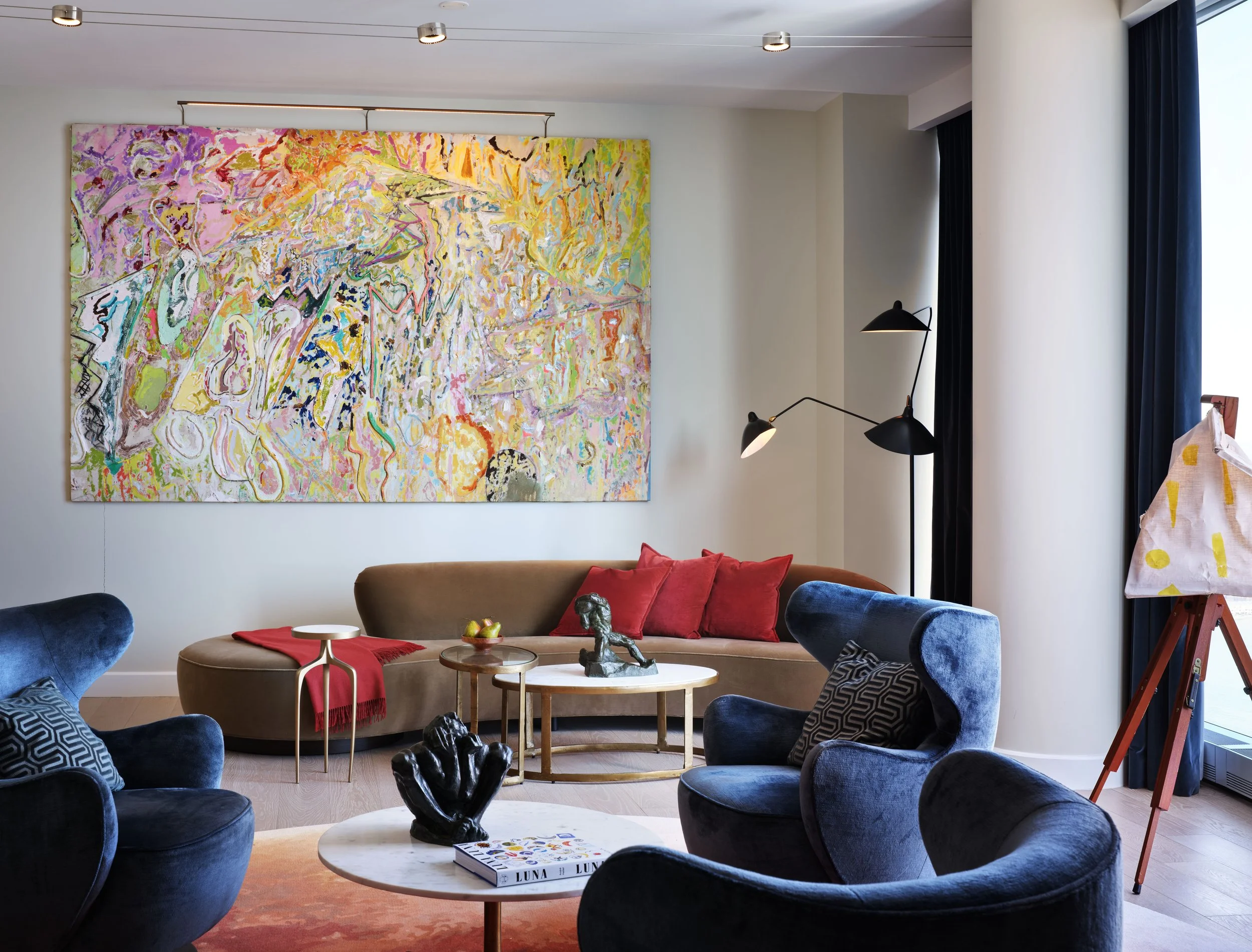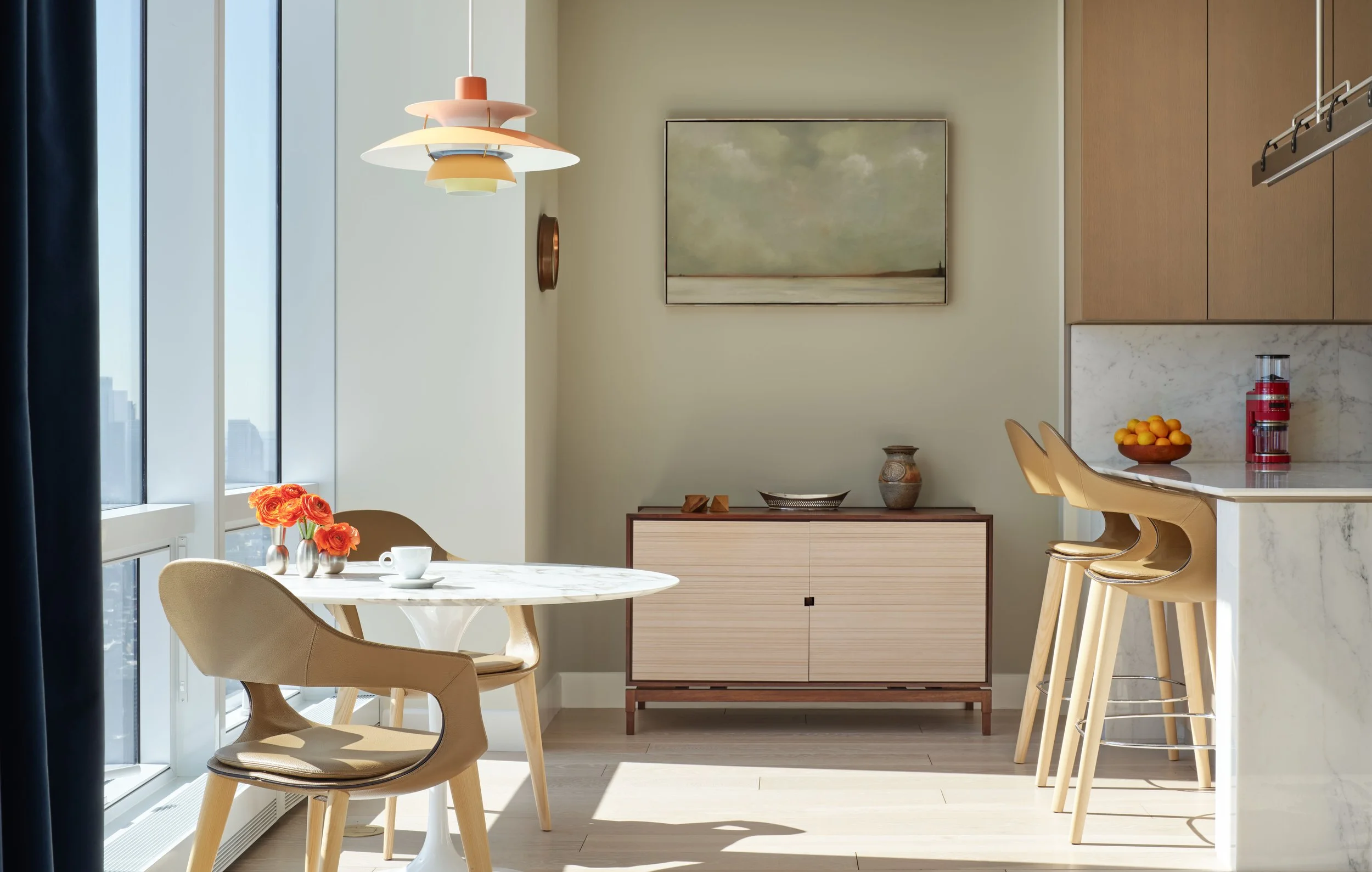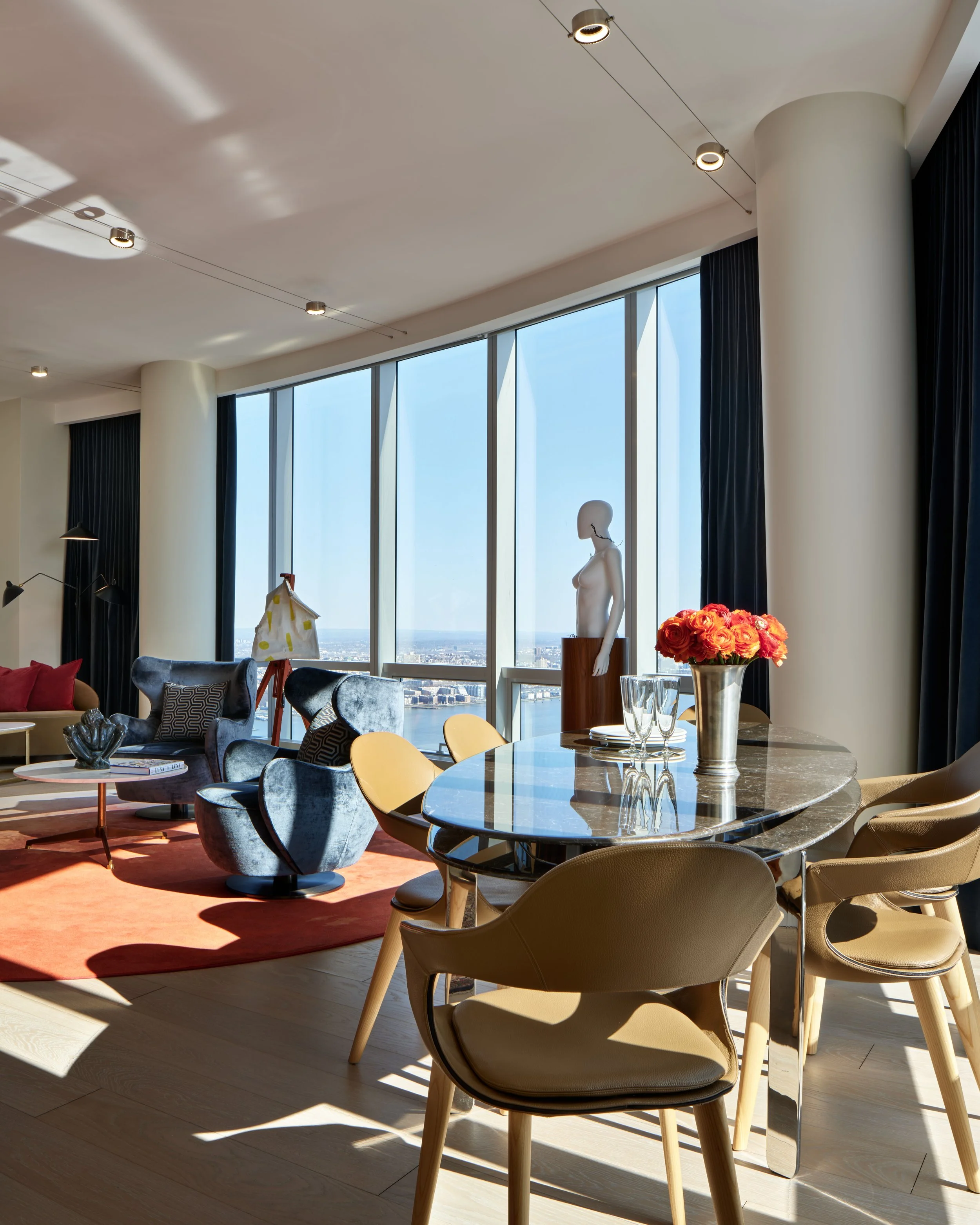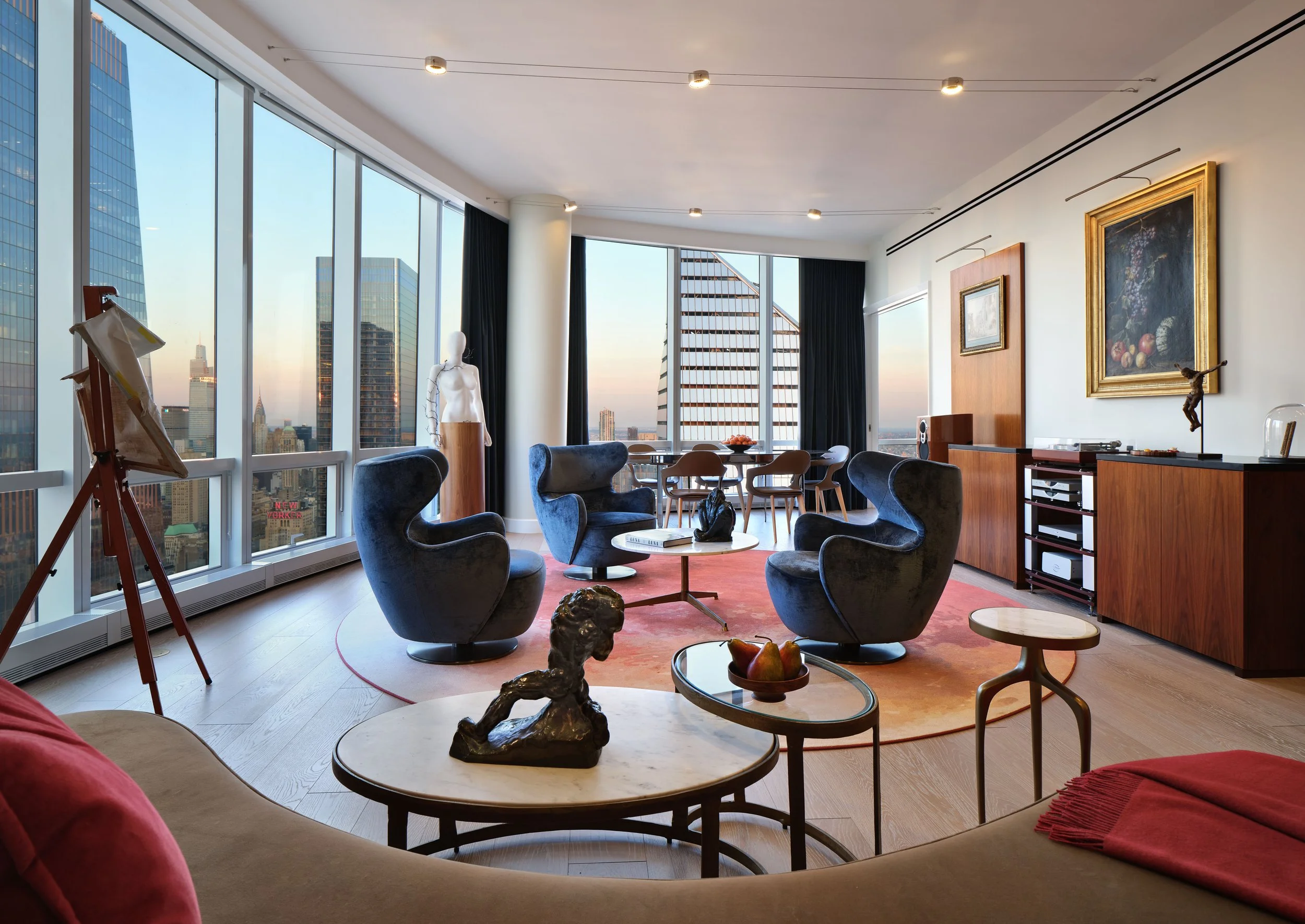 The concept for this penthouse is dom iz snova or dream home. Its location in the upper portion of 15 Hudson Yards brings magnificent views of the Hudson, the East River and the city at large.