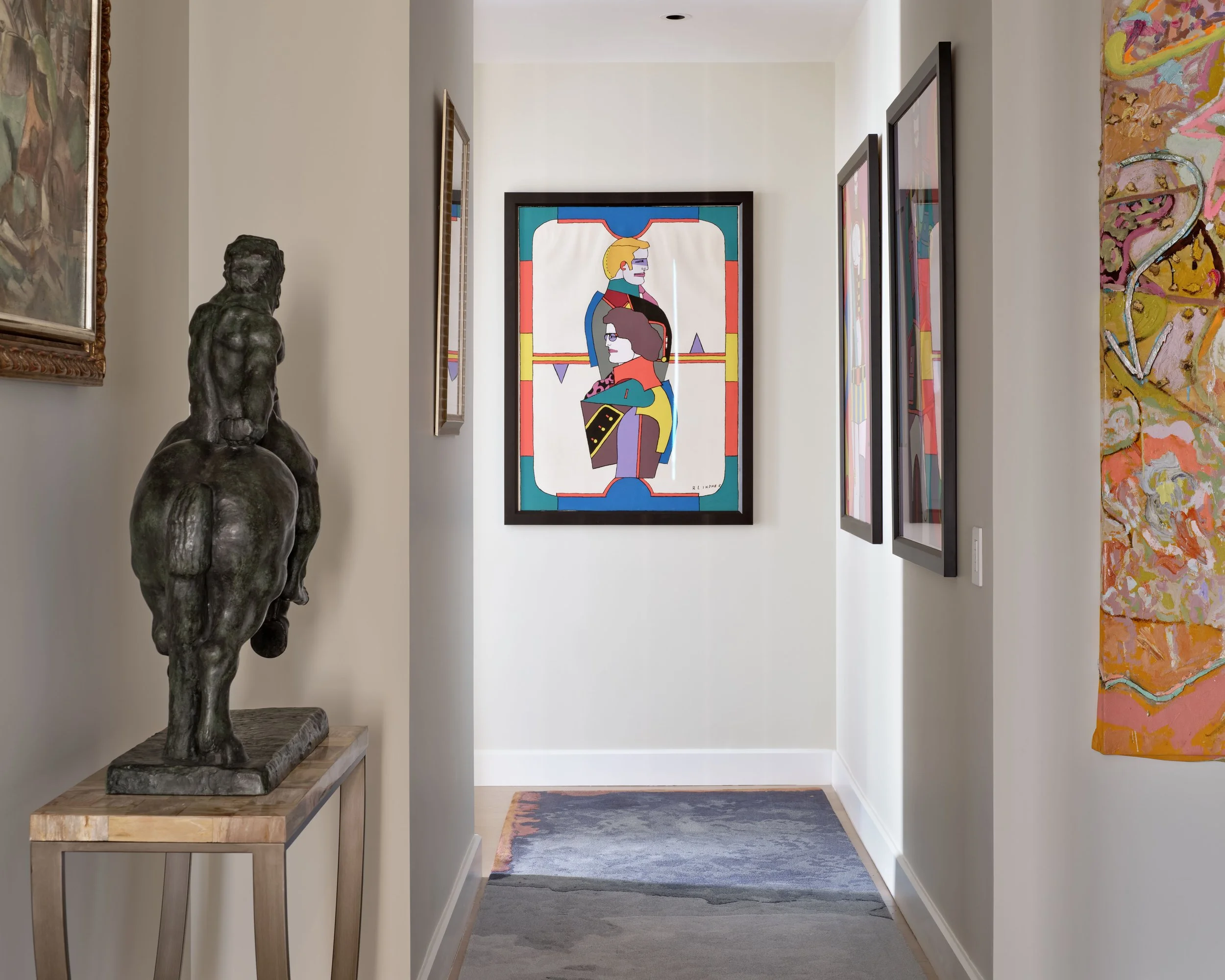 Each selection for furniture and finishes refers to a dream or references the sky. The Vladimir Kagan sofa and chairs have the softness of clouds. The living room area rug is an actual photograph of a lunar eclipse made by Moooi. The dining table shape references lenticular clouds. The dining chairs have an ethereal feel.