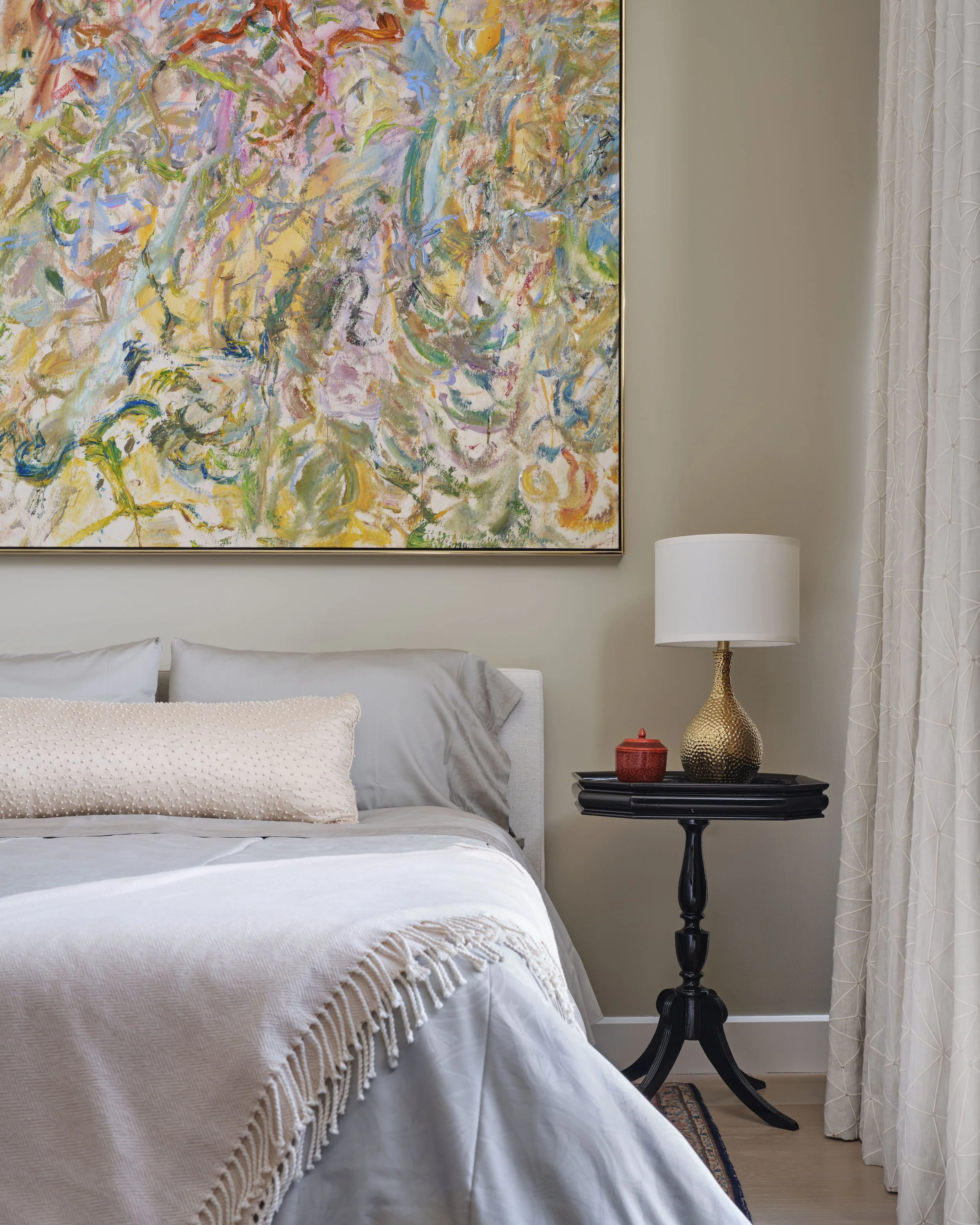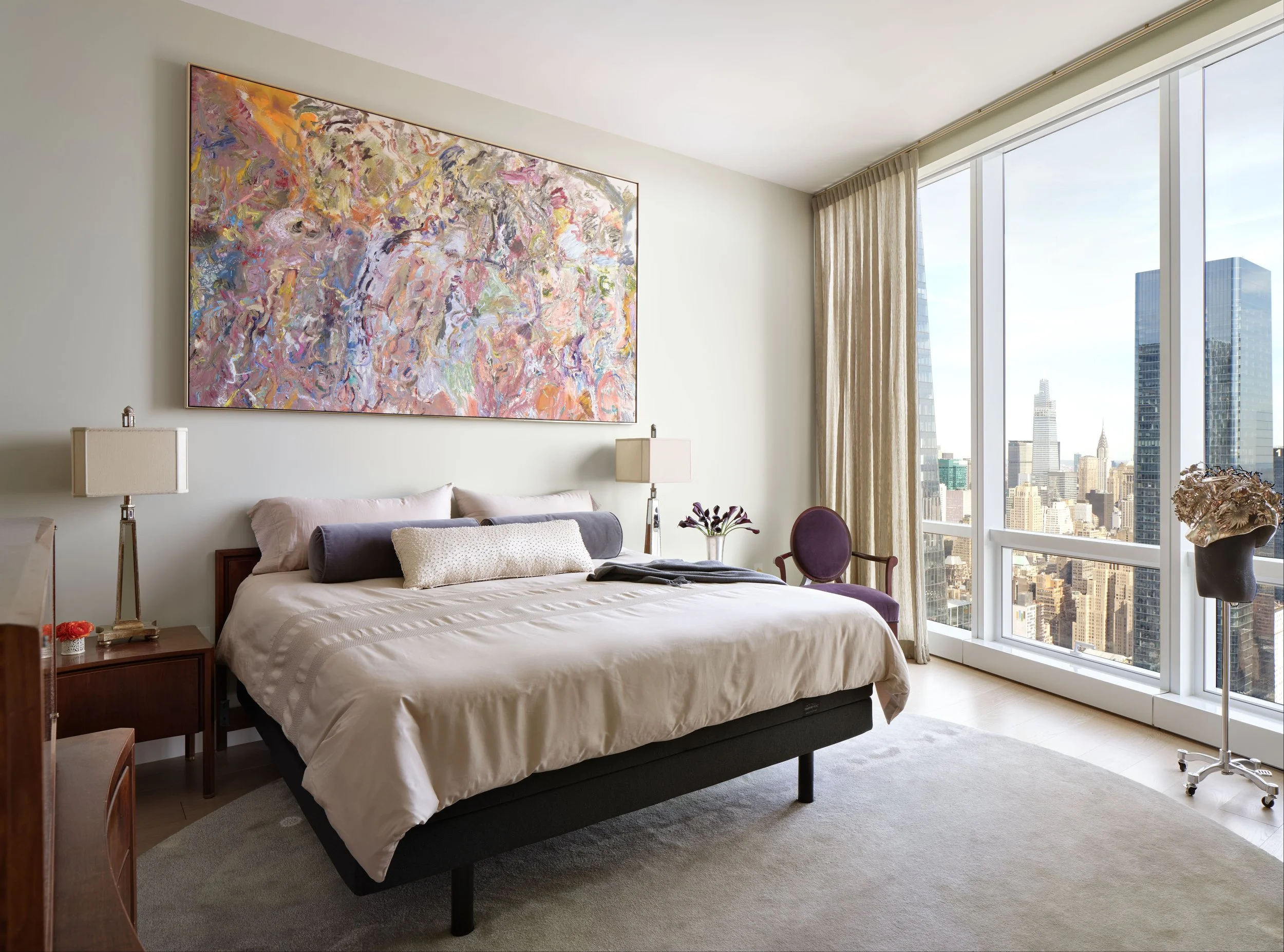 The master bedroom has a richness with the combination of light green and plum. Area rug in silk and wool is made by Fort Street Studio. The drapery is Gretchen Bellinger Isadora. Its flowing quality supports the dream home concept. The entire penthouse supports living the dream.