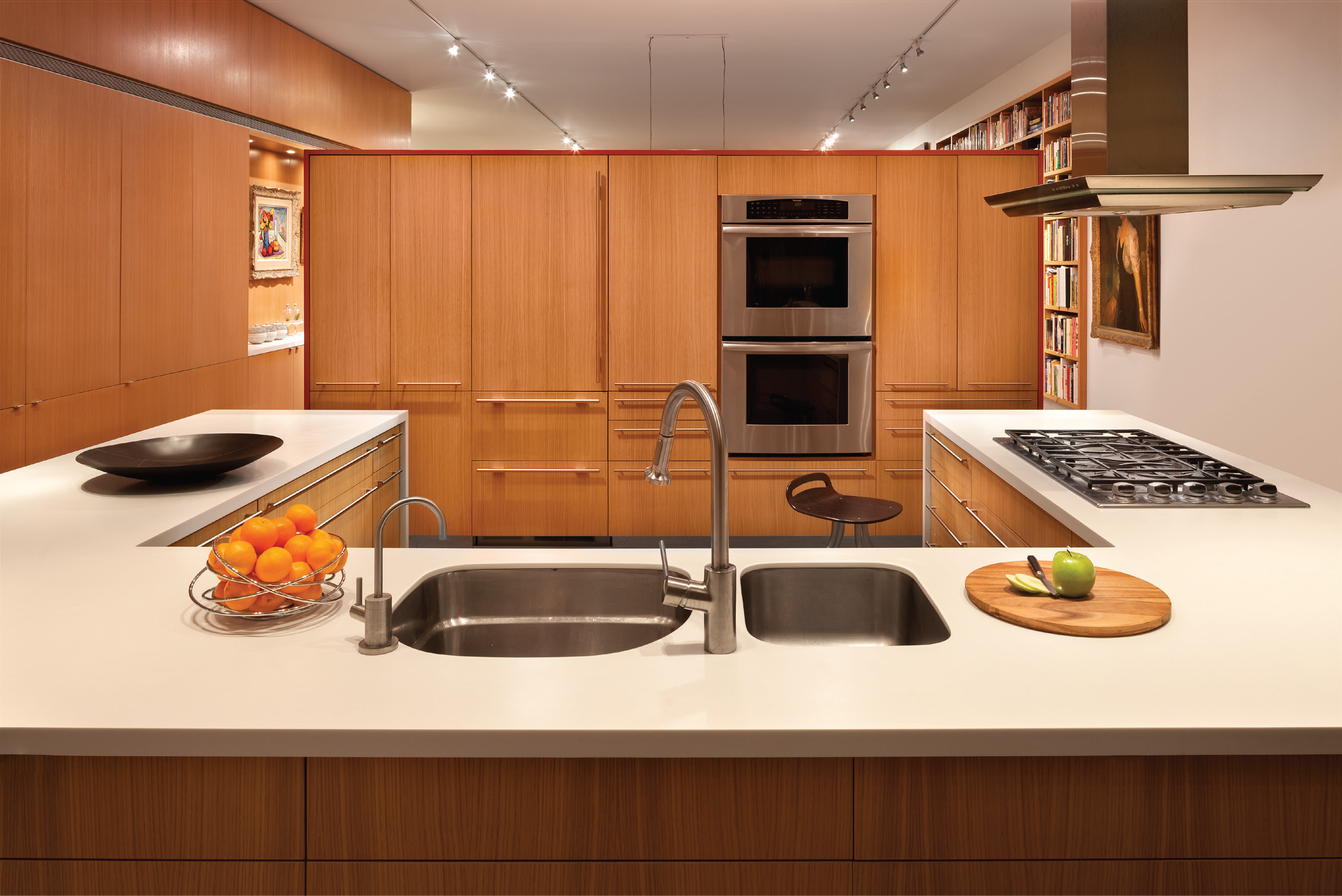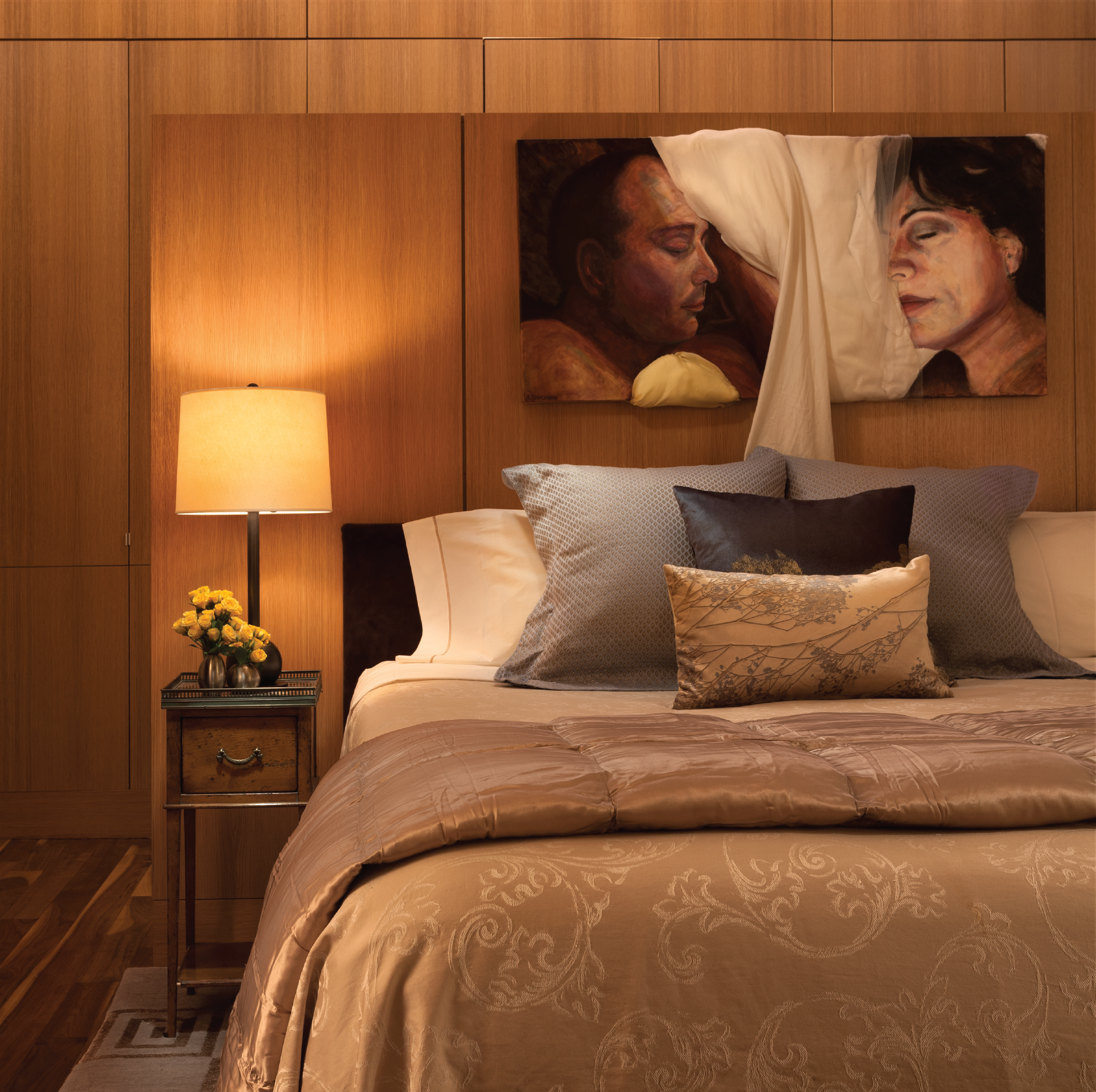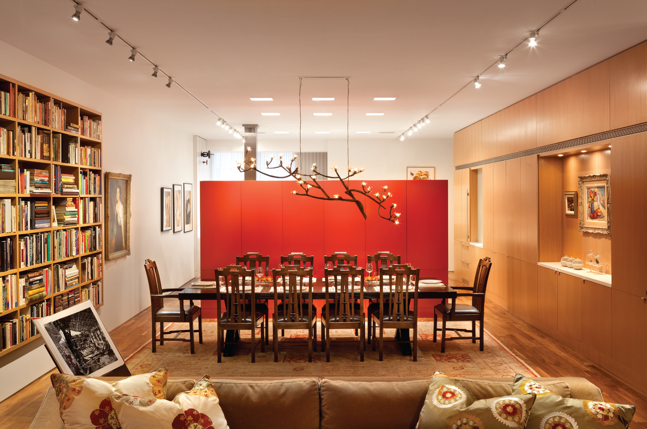 This Soho loft is the city home for a real estate developer and his artist wife. The space is a warm neutral backdrop for paintings, collage and sculptures. The spaces were anchored by treating the core with a warm encaustic plaster. The Avery Boardman sofas in the living room are upholstered in a camel colored Rodolph mohair. The Tucker Robbins coffee table and Eda Ka citrine and bronze twig dining pendant bring nature and luster to the room. The classic marble Saarinen table in the breakfast area provides the perfect place for morning coffee. The leather Poltrona Frau dining chairs provide warmth and durability. The experience when here is one of relaxed sophistication.