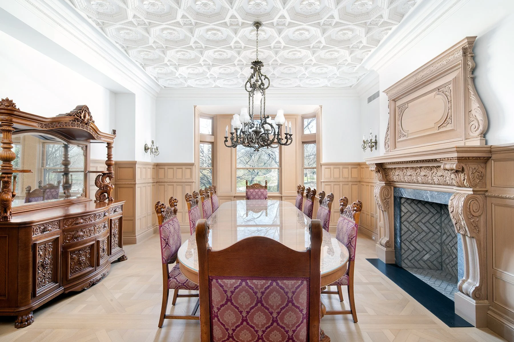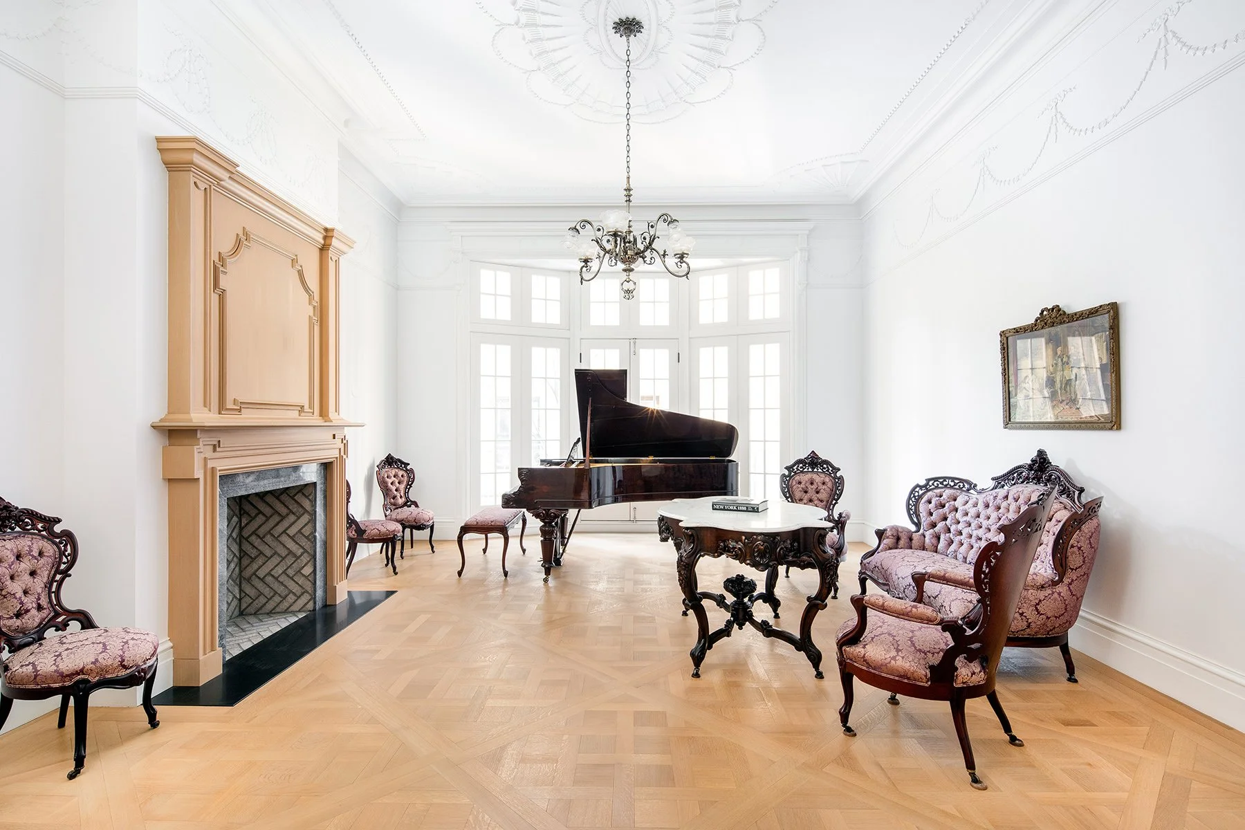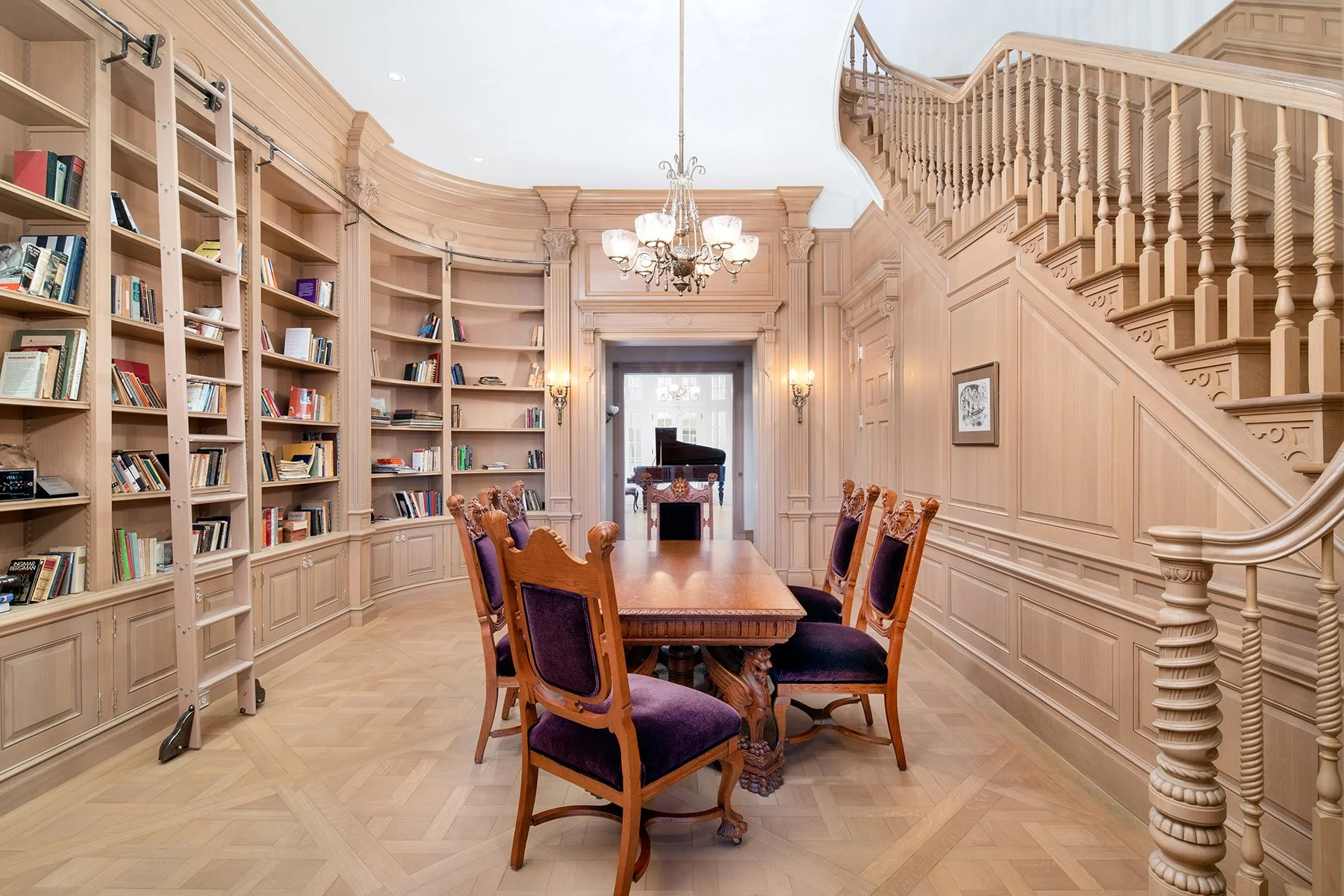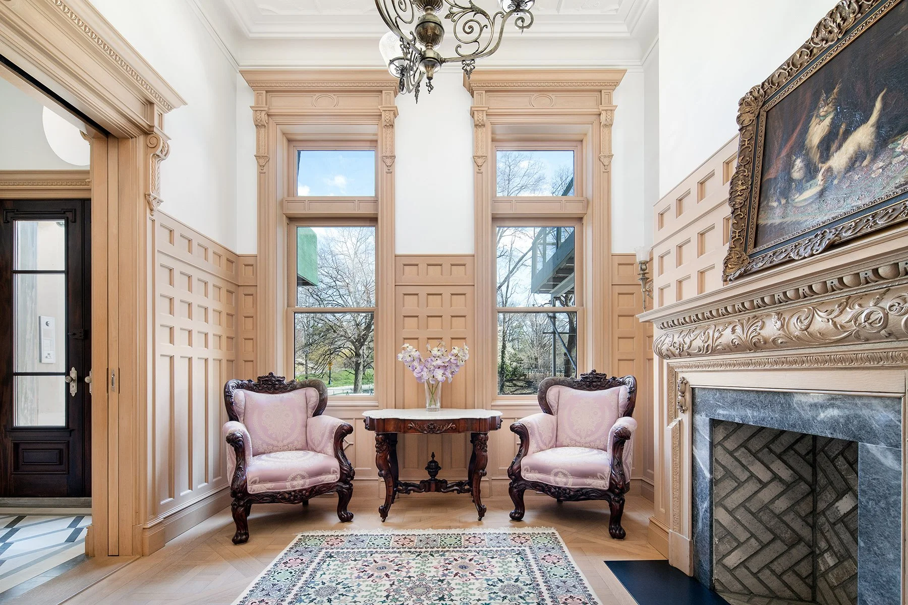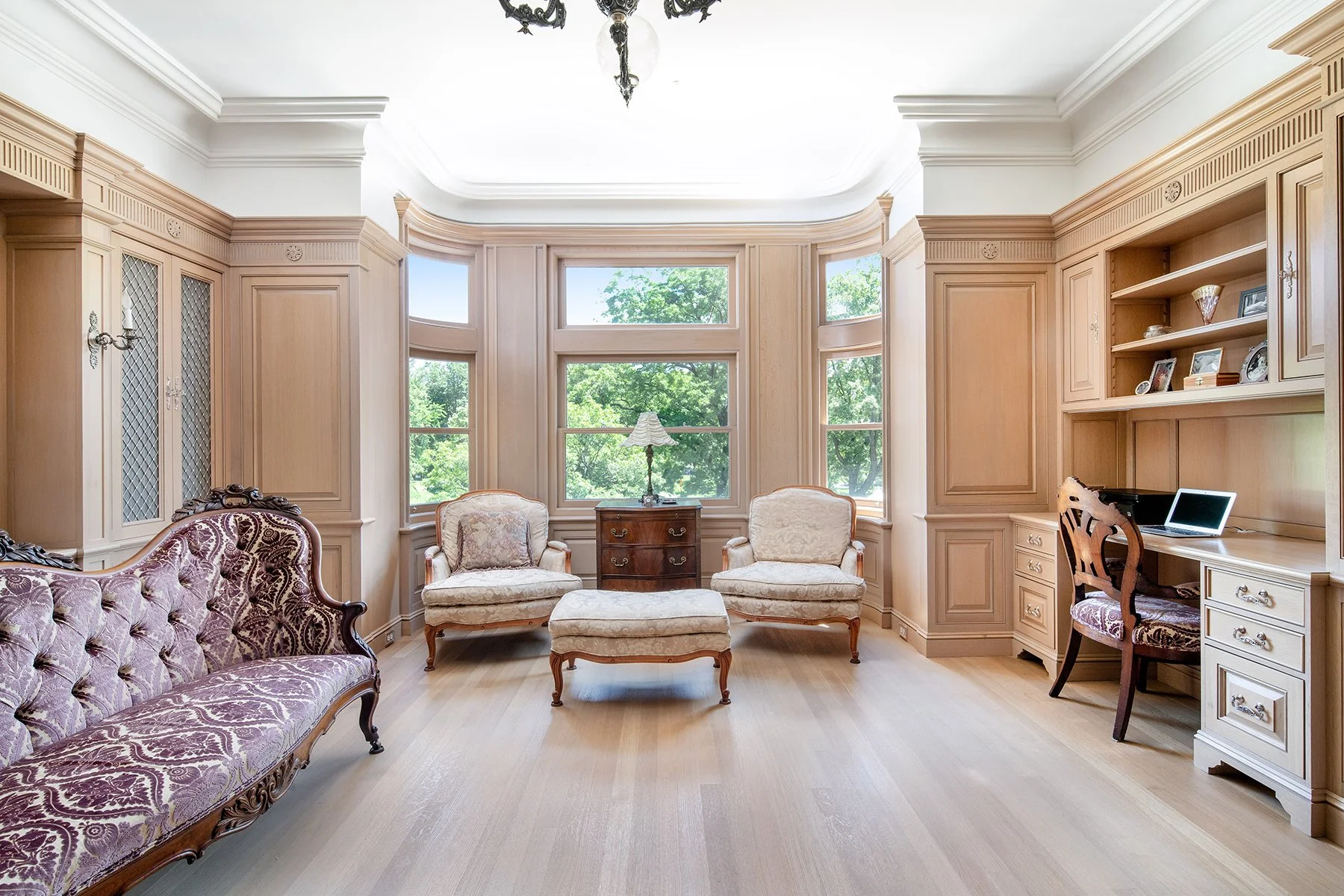This 1887 Queen Anne mansion is one of the very few remaining townhouses on Central Park West. The client loved the provenance of the building. The interior is modernized with quarter sawn white oak paneling and all modern conveniences while maintaining period interior details. A natatorium resides in the cellar. Fabric colors used are primarily lavenders and light pinks. Furniture and lighting selected are all period pieces. The result is a beautiful envelope of light with contrasting dark framed furniture creating a pleasing balance of old and new.