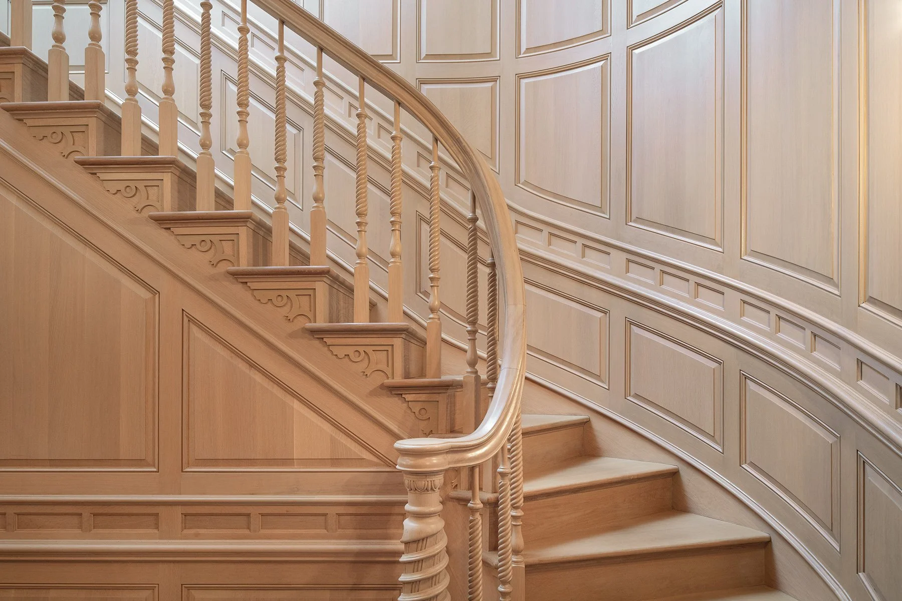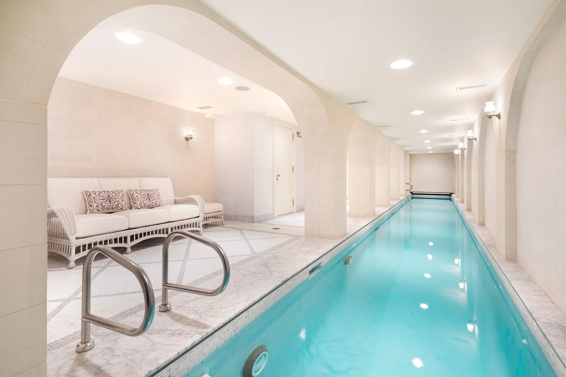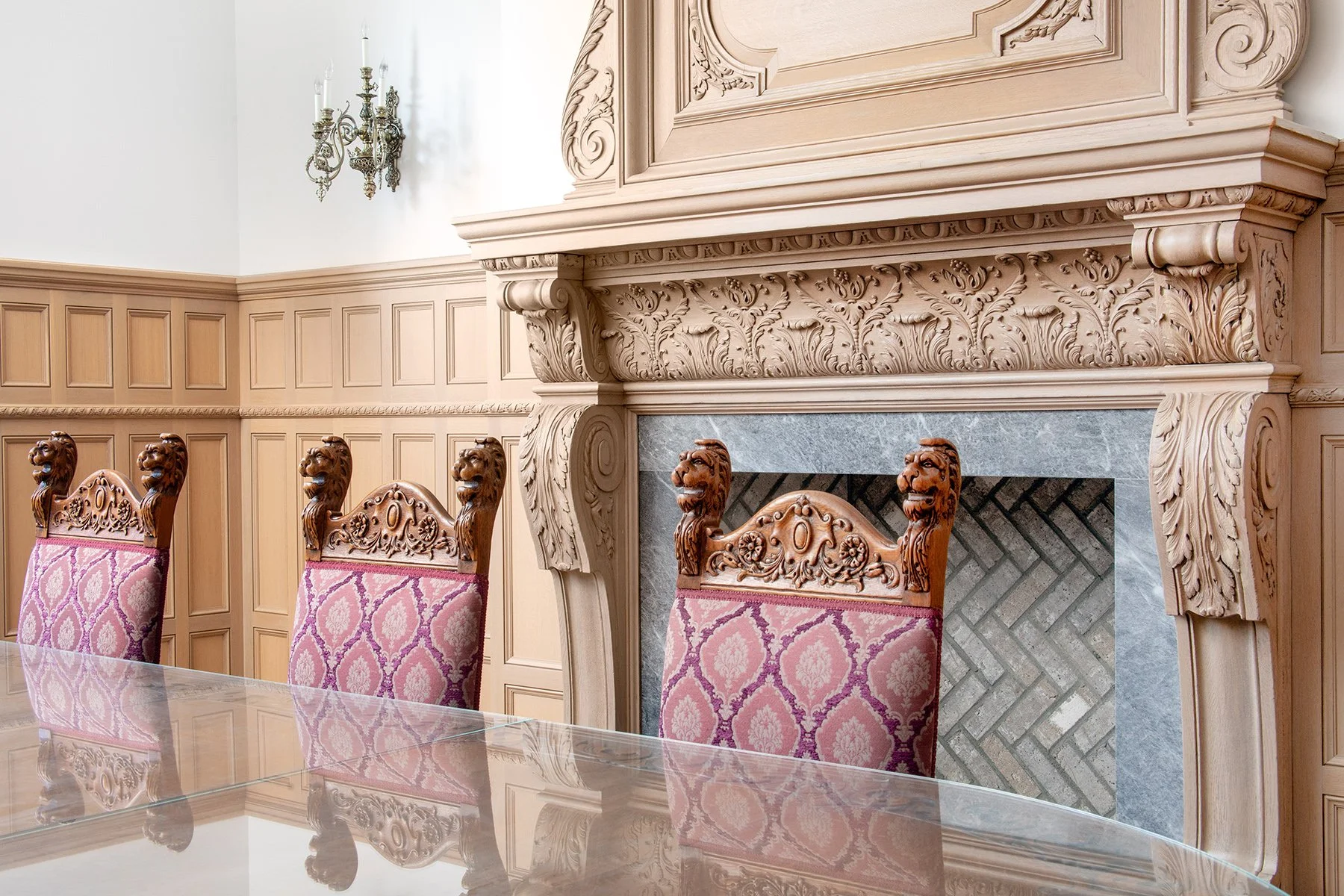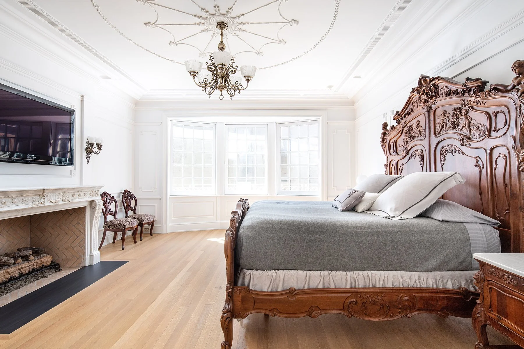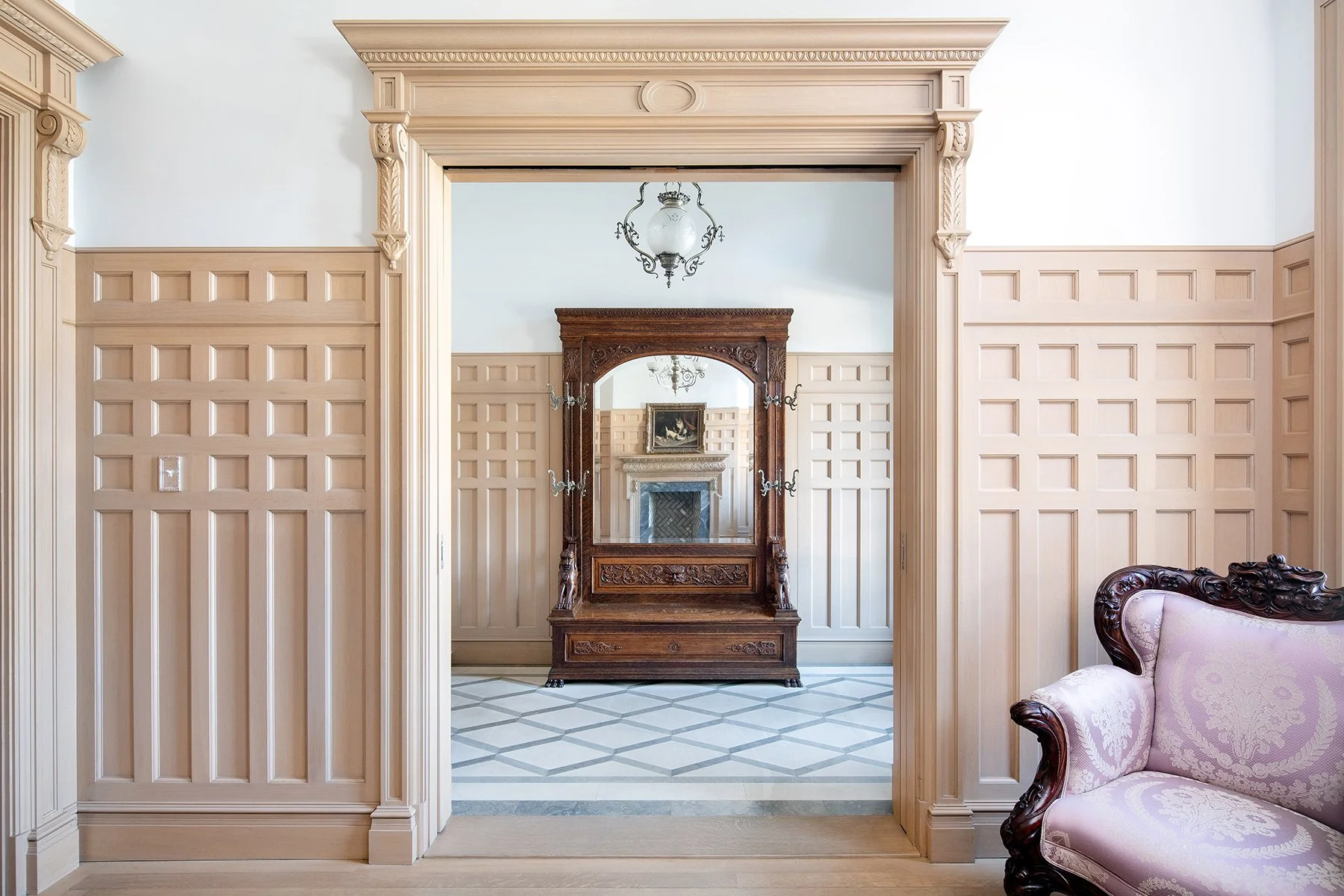 This 1887 Queen Anne mansion is one of the very few remaining townhouses on Central Park West. The client loved the provenance of the building. The interior is modernized with quarter sawn white oak paneling and all modern conveniences while maintaining period interior details. A natatorium resides in the cellar. Fabric colors used are primarily lavenders and light pinks. Furniture and lighting selected are all period pieces. The result is a beautiful envelope of light with contrasting dark framed furniture creating a pleasing balance of old and new.
