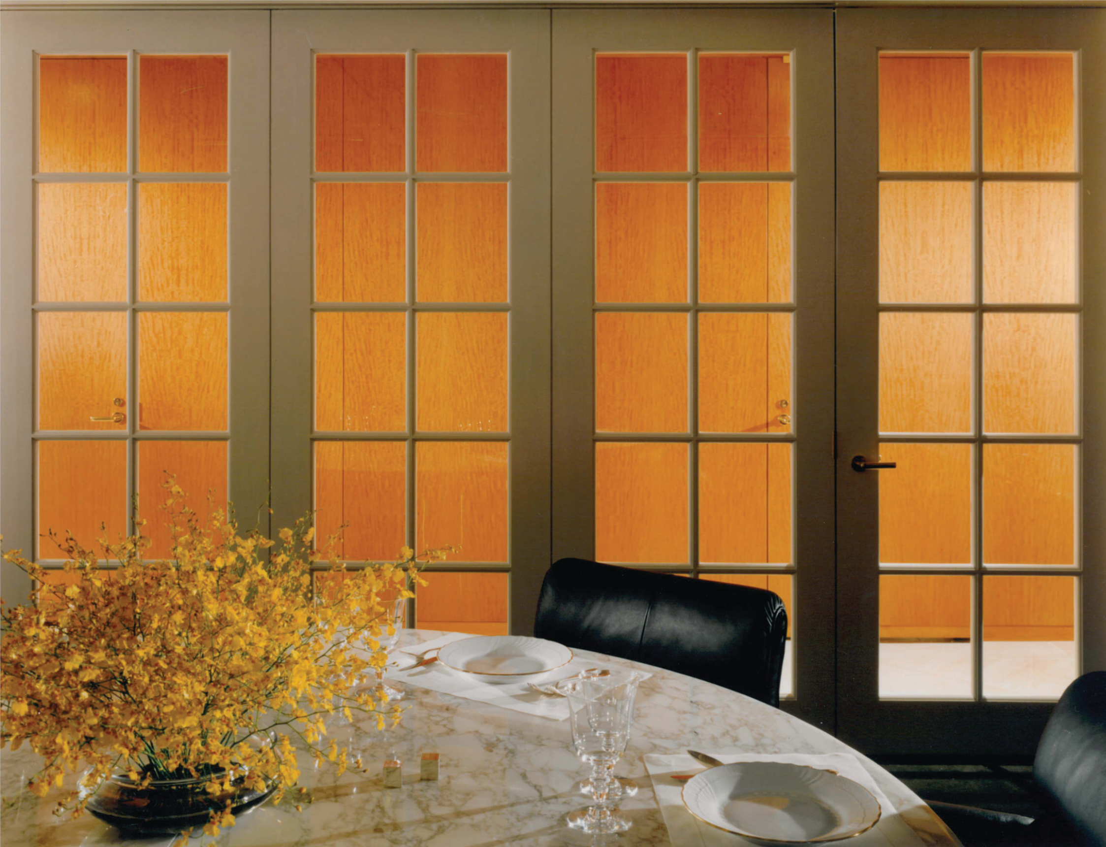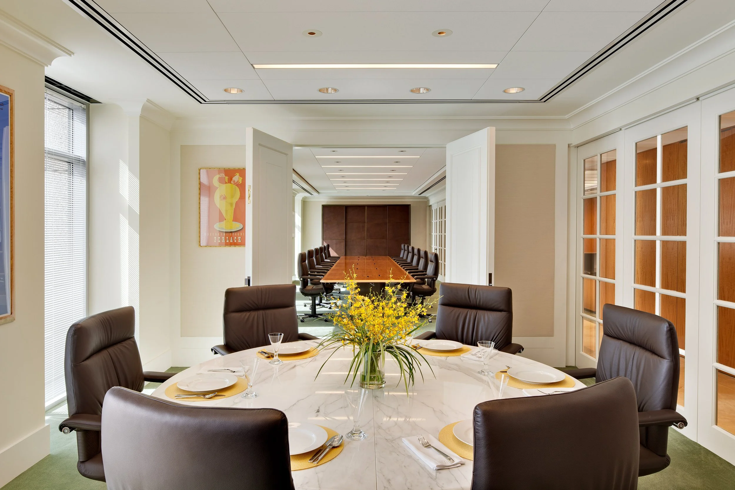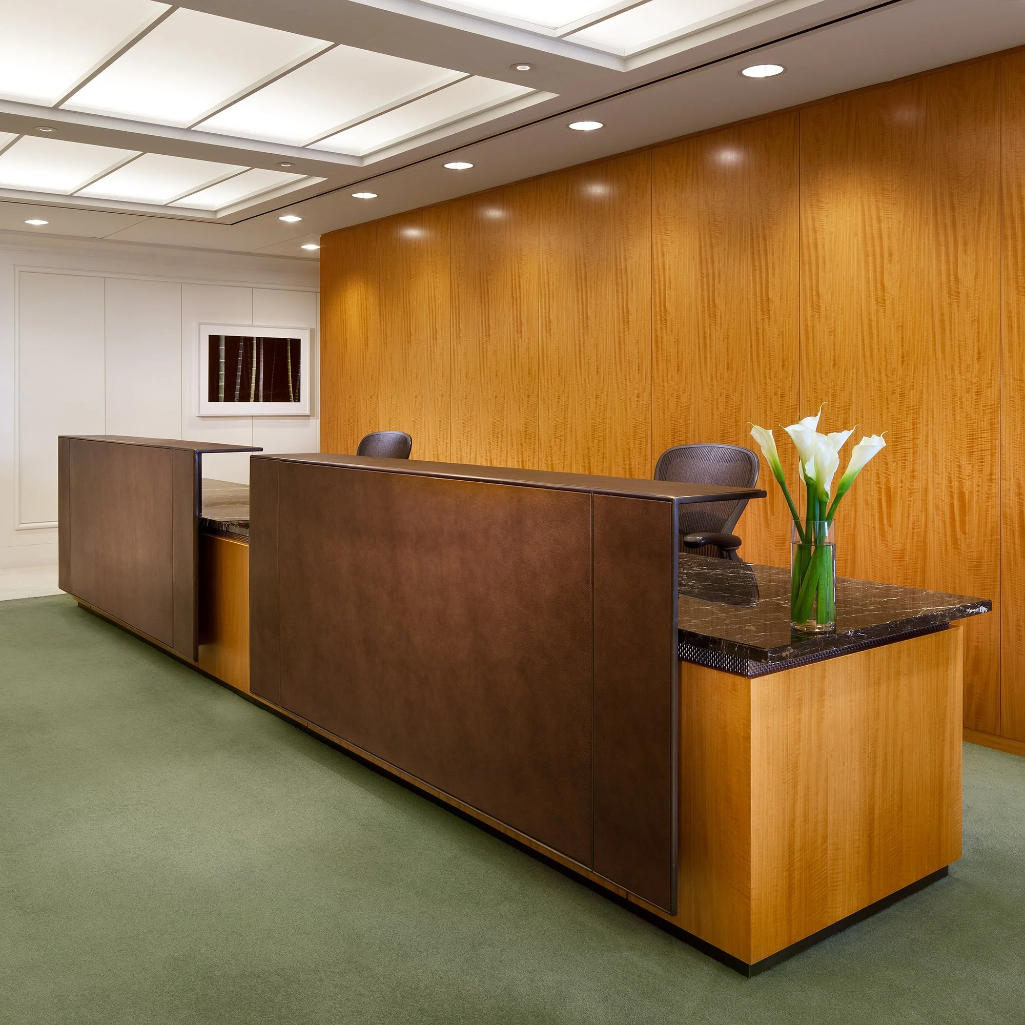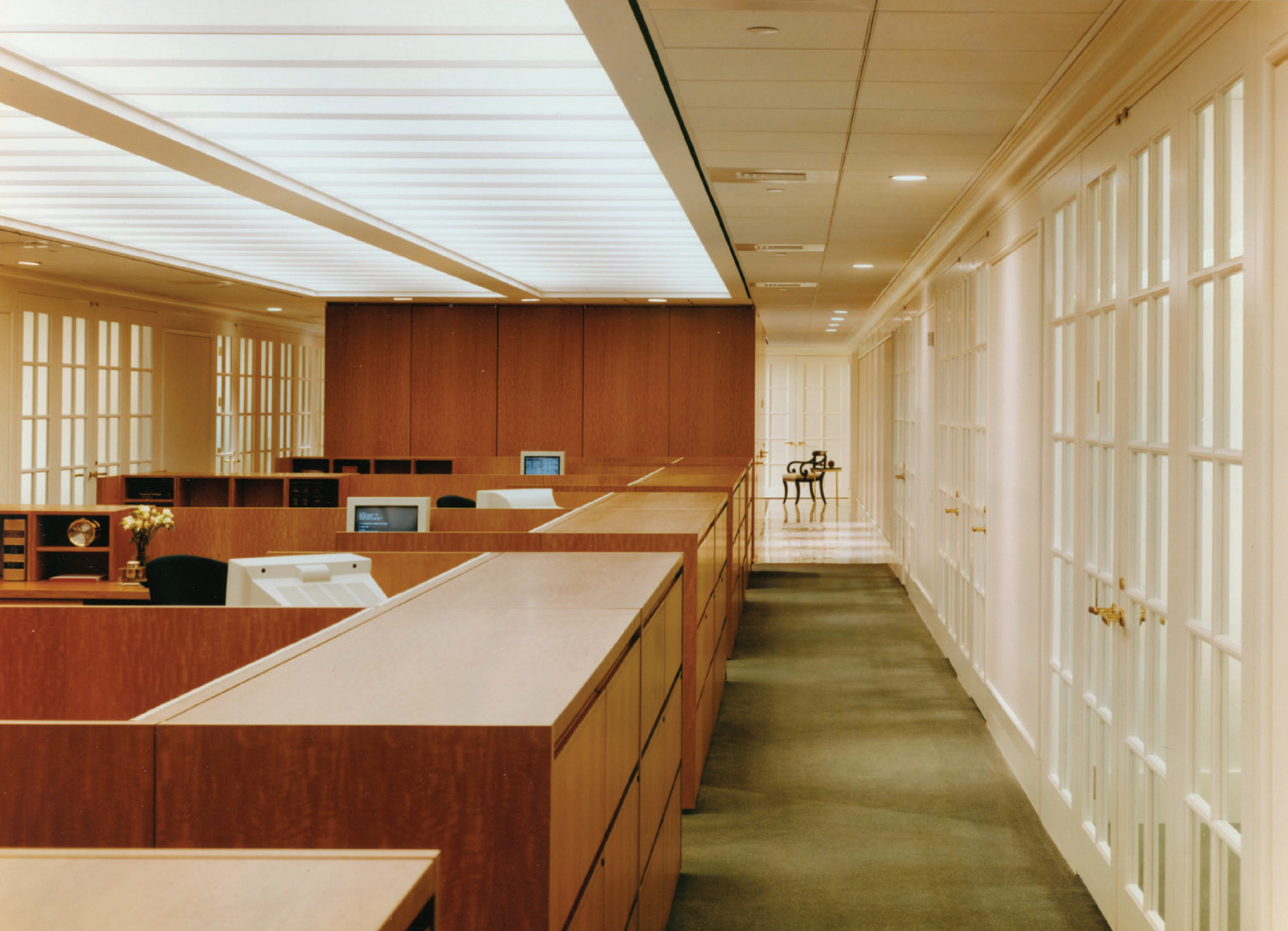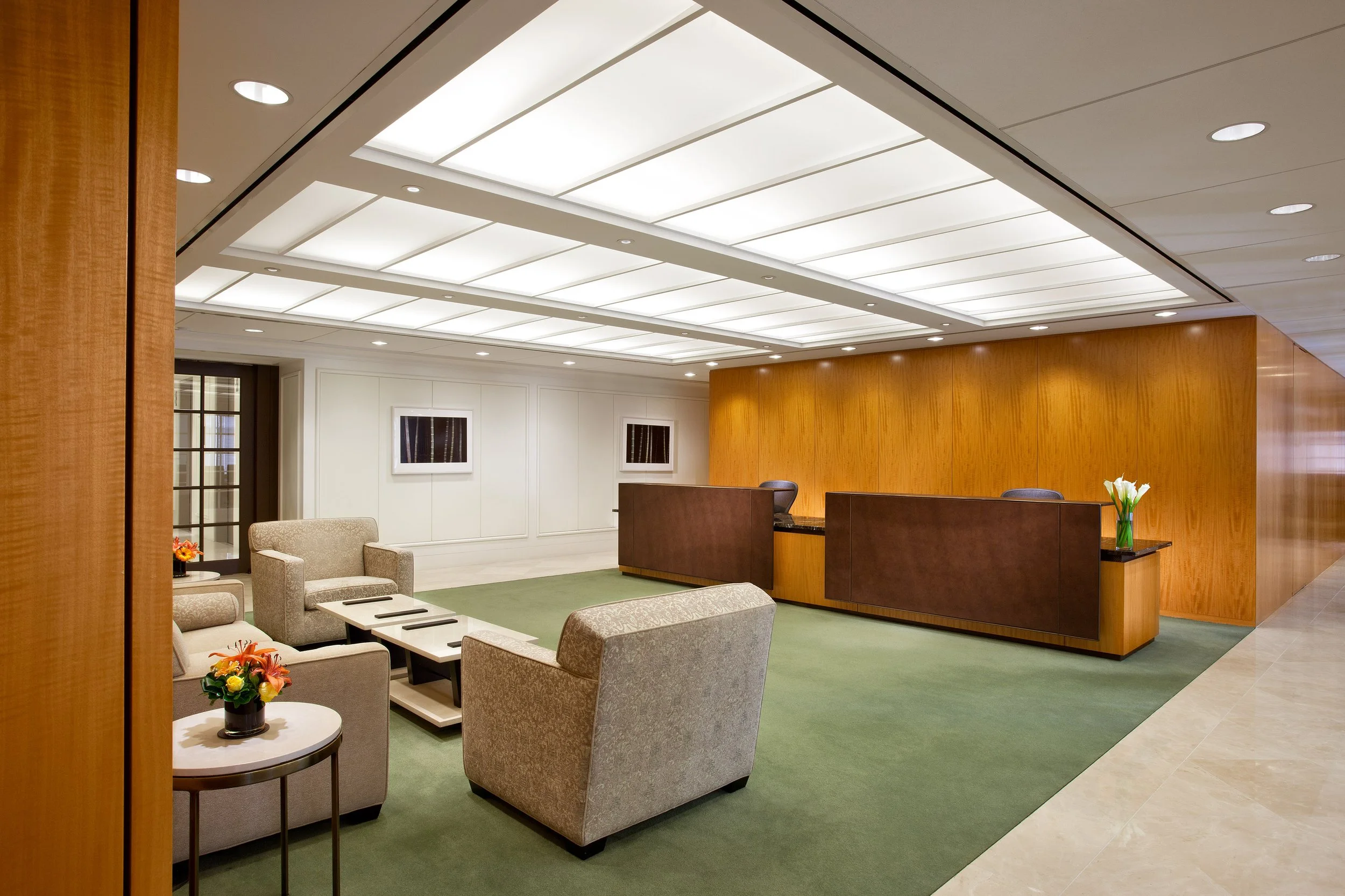 The first JLL Partners project completed by Cat Lindsay in 1994 developed a parti and aesthetic the firm wanted to continue for their new full floor occupancy at 450 Lexington. Offices are placed at the perimeter with french doors and sidelights as the office front to permit light and visibility while maintaining a sense of enclosure. Teams are clustered in the center to benefit from ‘cross pollination’. The green carpet and anigre wall panels and desks give the space a sense of warmth and comfort. Ceilings are predominantly lay lights with large format acoustic tiles framing the pop ups. Amenities to the new space include a large lunchroom facing the city and an expanded conference center.