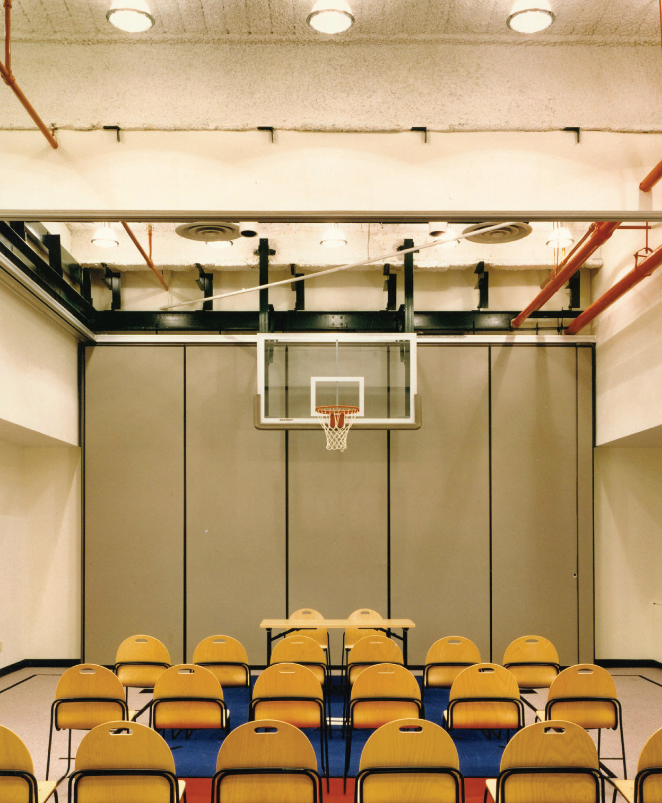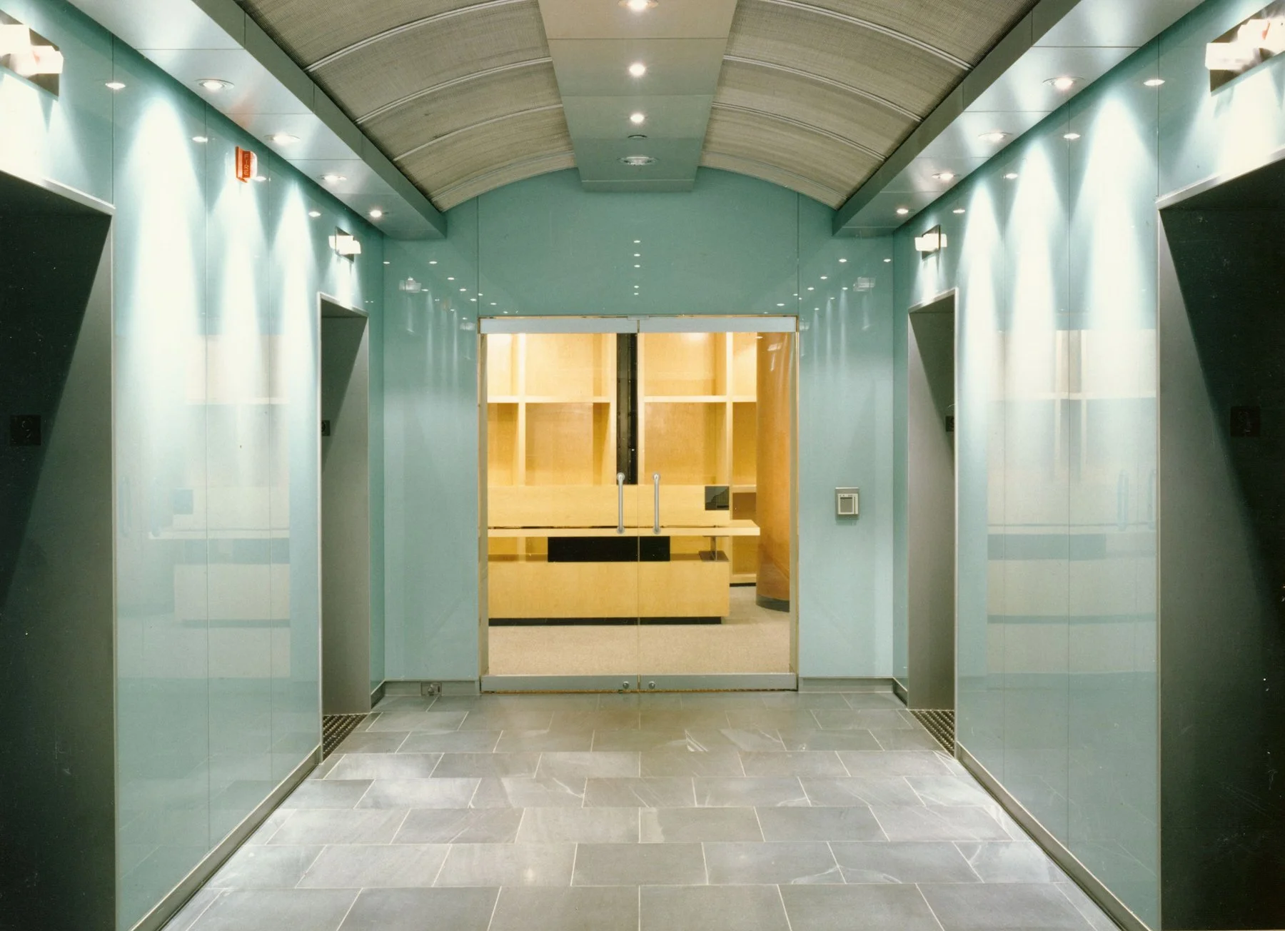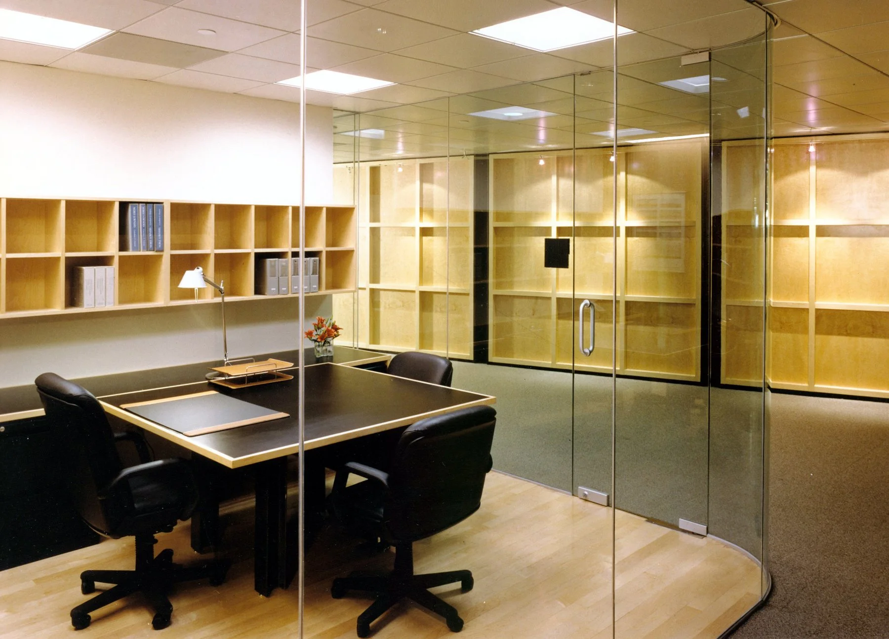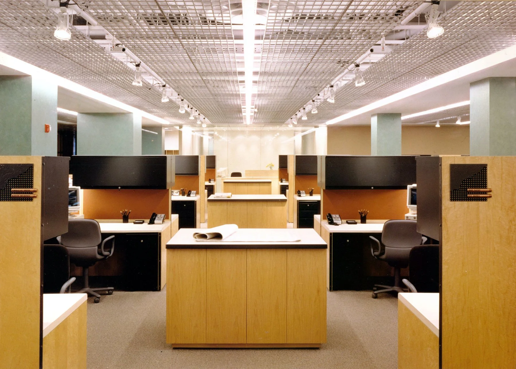 The 45,000 sf offices at 200 Park were designed to support the vision of Peter Lehrer where everything selected must relate somehow to the construction industry. The carpet resembles concrete. The wallcovering looks like corrugated cardboard. The plaster columns are built to illustrate how plaster and lath are assembled to create the enclosure. The ceiling is open aluminum grilles with lighting and building systems coordinated between and above the panels. The desks are made of wood panels with metal trim.