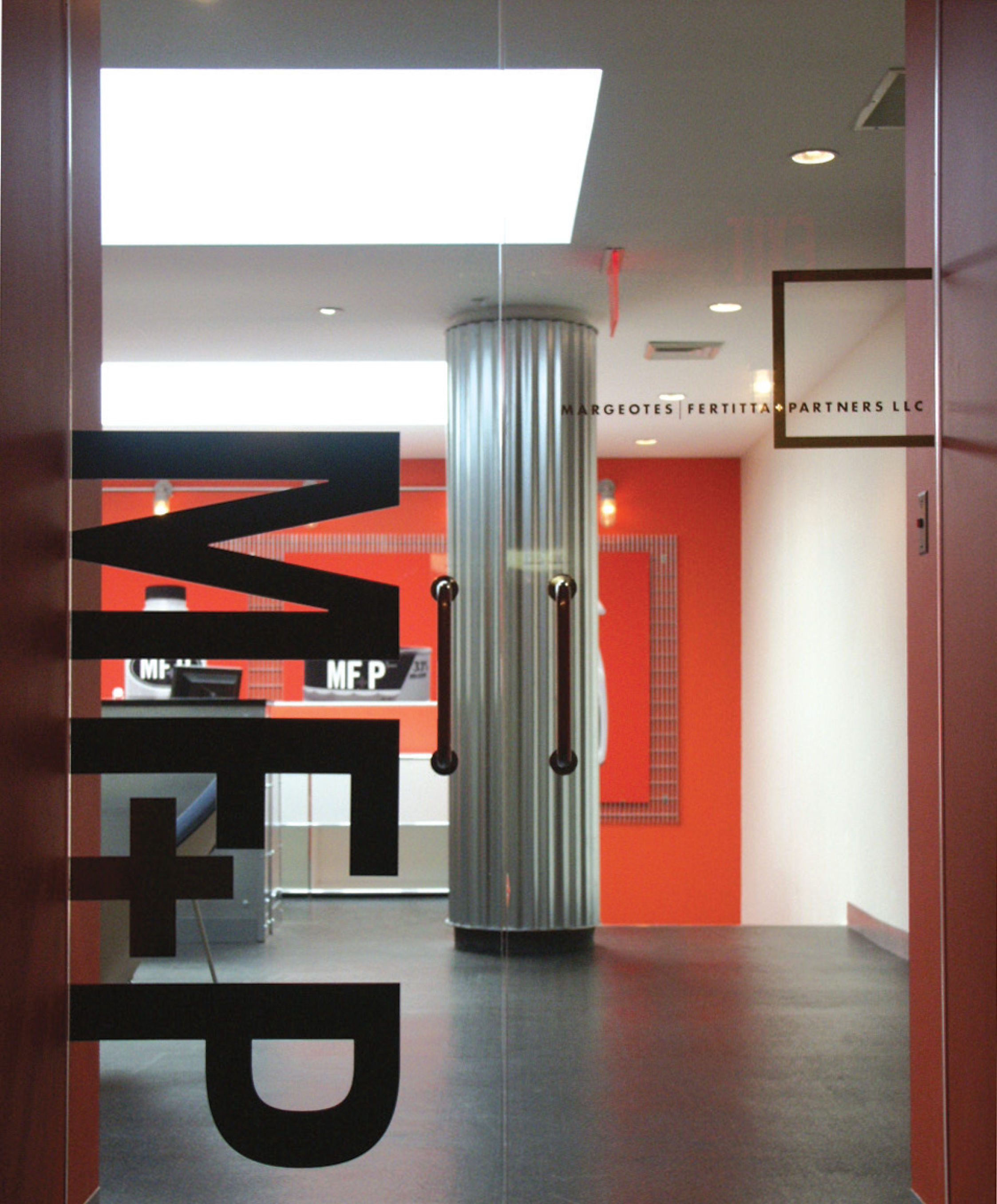 The reception and central lounge on the lower level area carpet were replaced with a rubber floor, the wood veneer column enclosures replaced with corrugated steel and subway grating became the back drop for marketing campaigns. The reception desk cladding became galvanized steel with exposed fasteners. Their new poppy red color reflects the energy and enthusiasm they bring to every assignment.