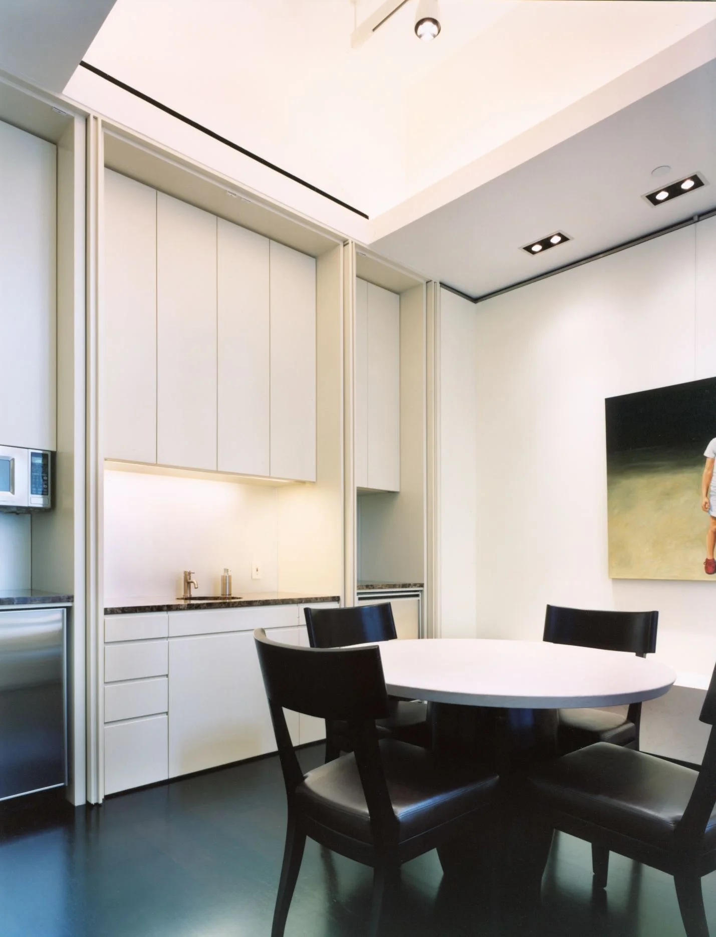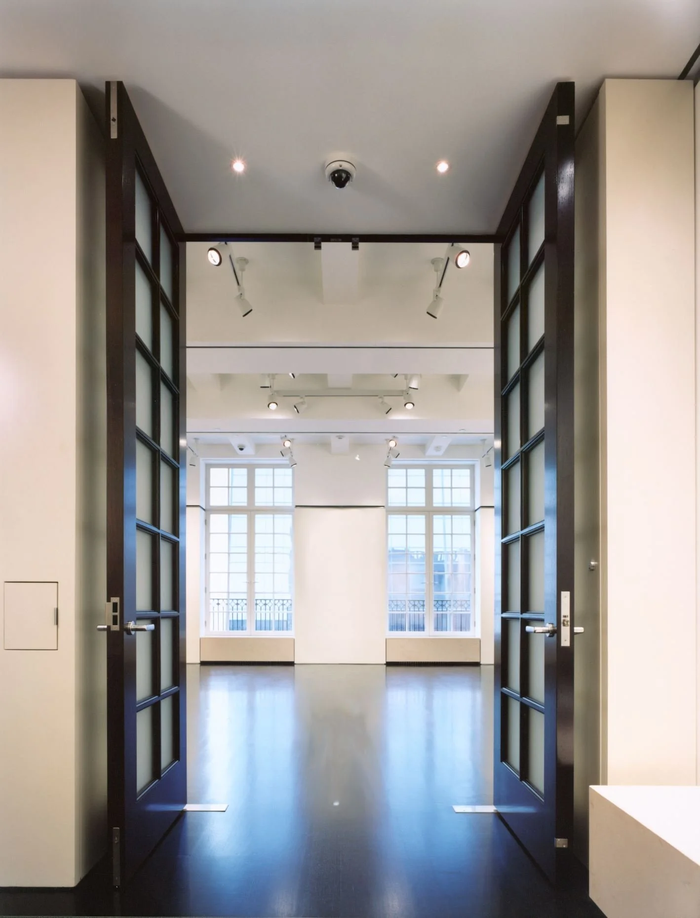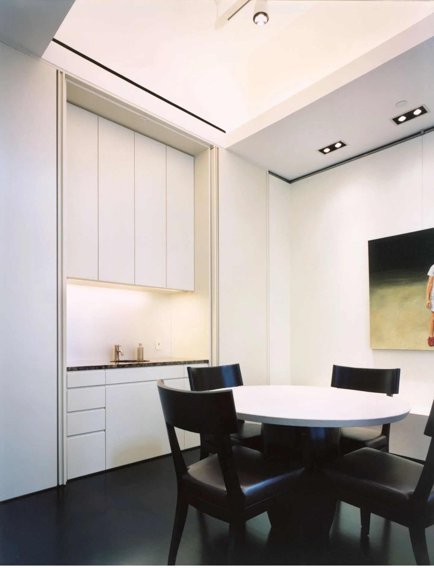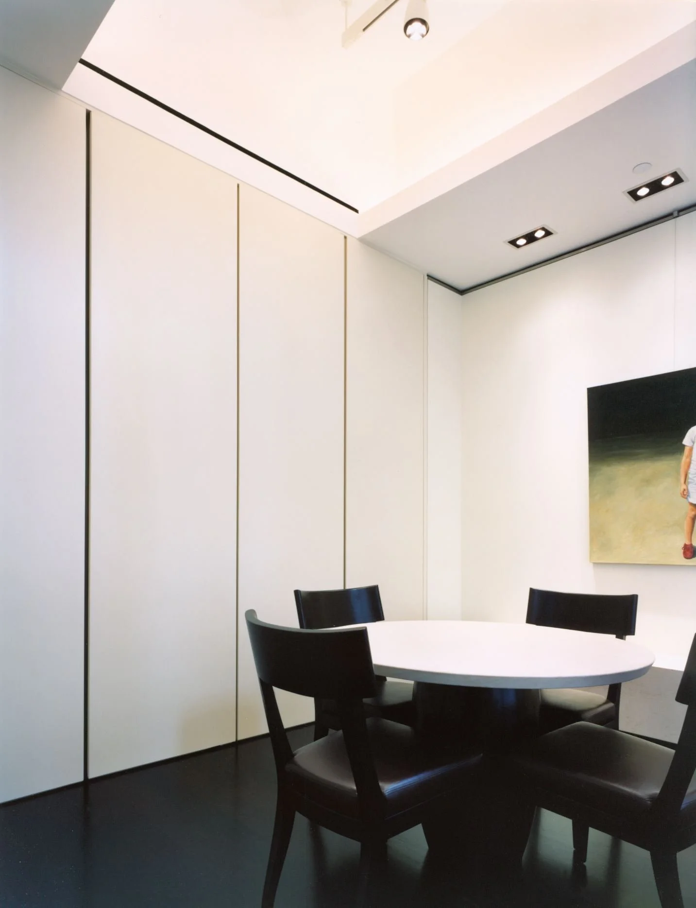 This private art gallery is designed to maximize art display with a custom designed art hanging system at the perimeter and an invented central display wall that moves laterally across the room as well as opens into as many as eight display panels. The dark wenge floors are contrasted by light lacquered walls with limestone benches and tables. The large French entry doors draw reference to the building windows.