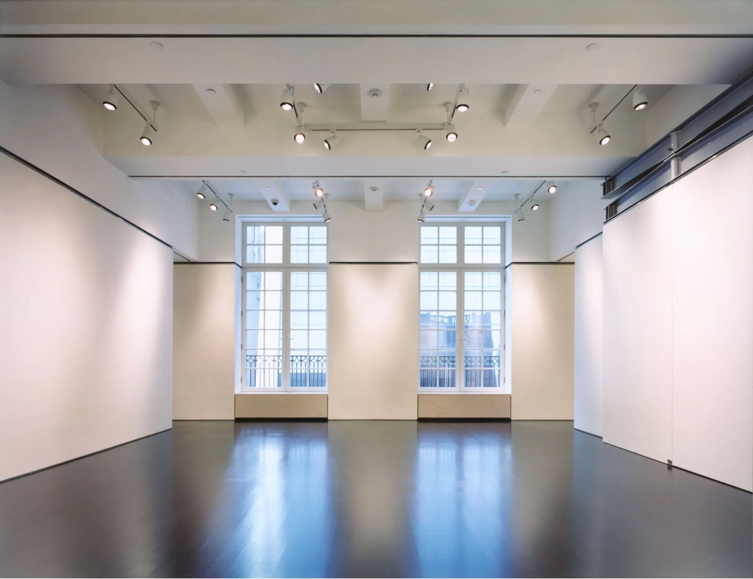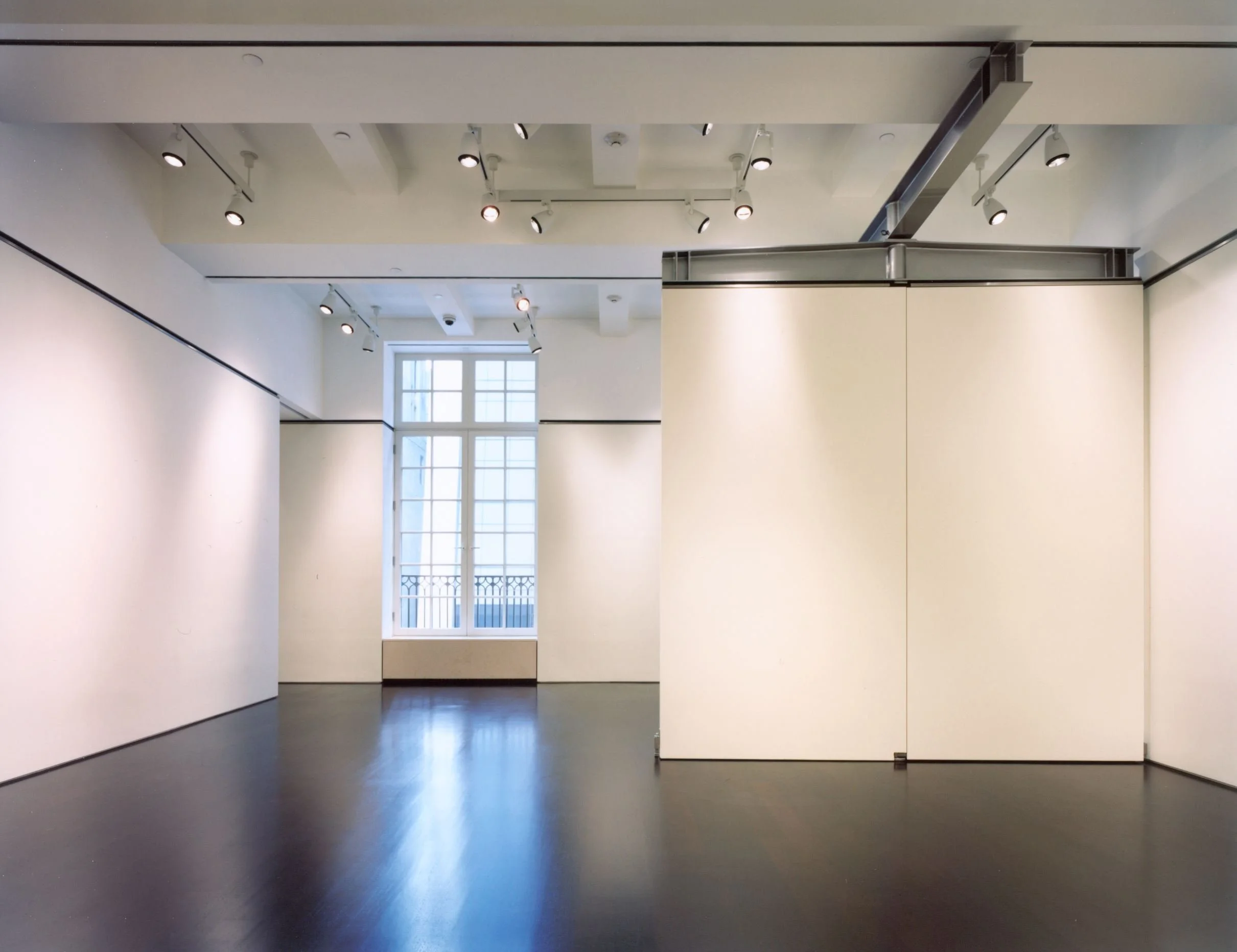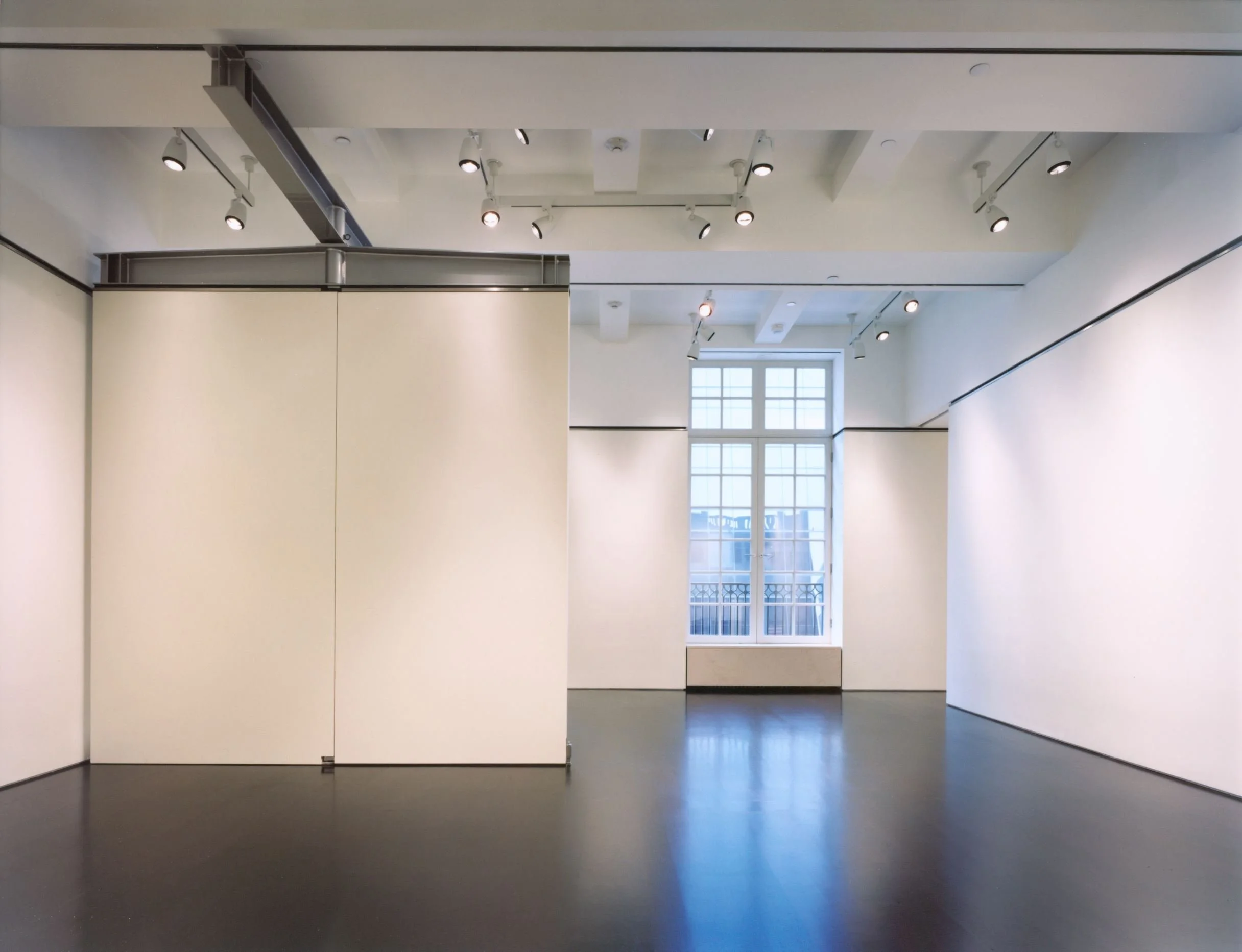 This private art gallery is designed to maximize art display with a custom designed art hanging system at the perimeter and an invented central display wall that moves laterally across the room as well as opens into as many as eight display panels. The dark wenge floors are contrasted by light lacquered walls with limestone benches and tables. The large French entry doors draw reference to the building windows.