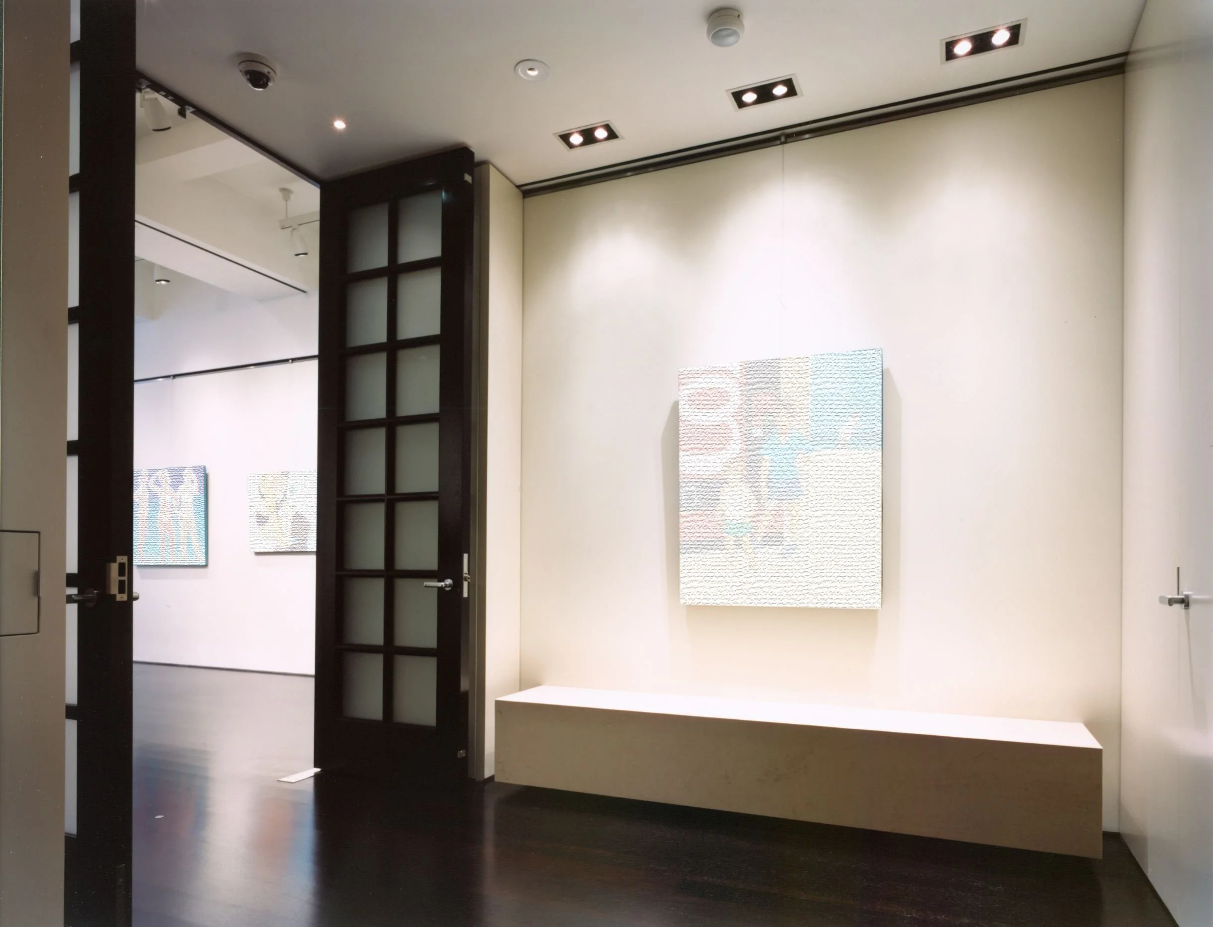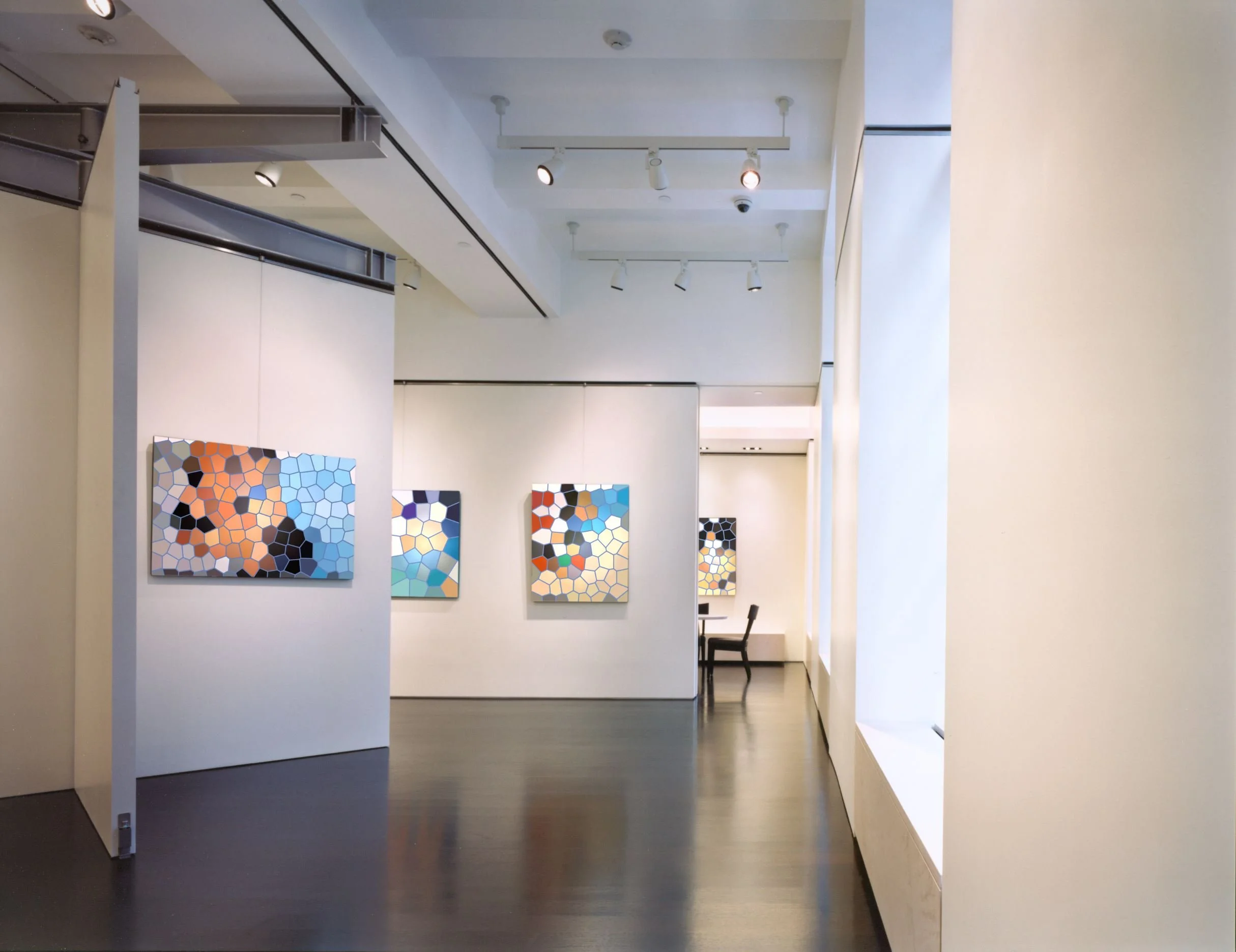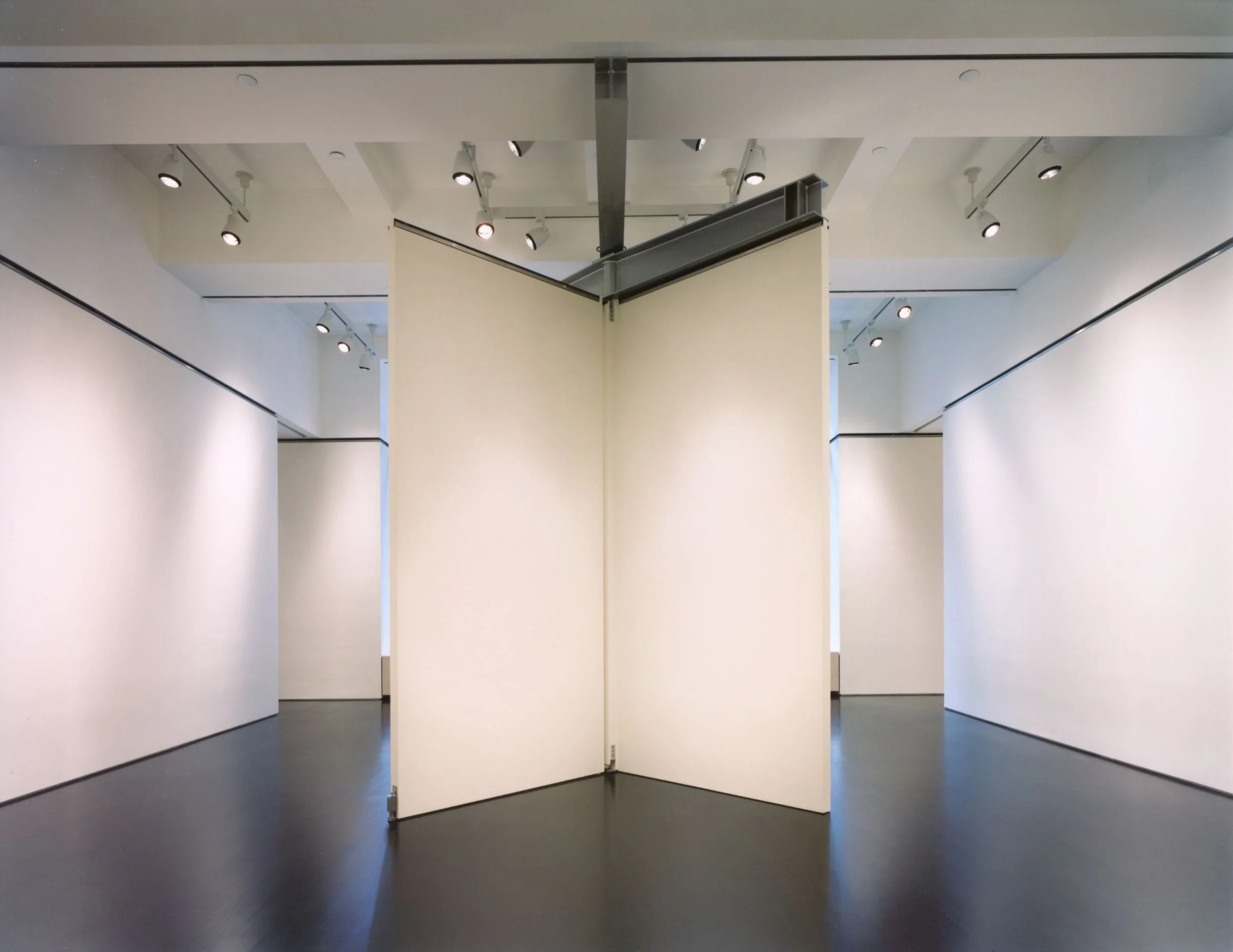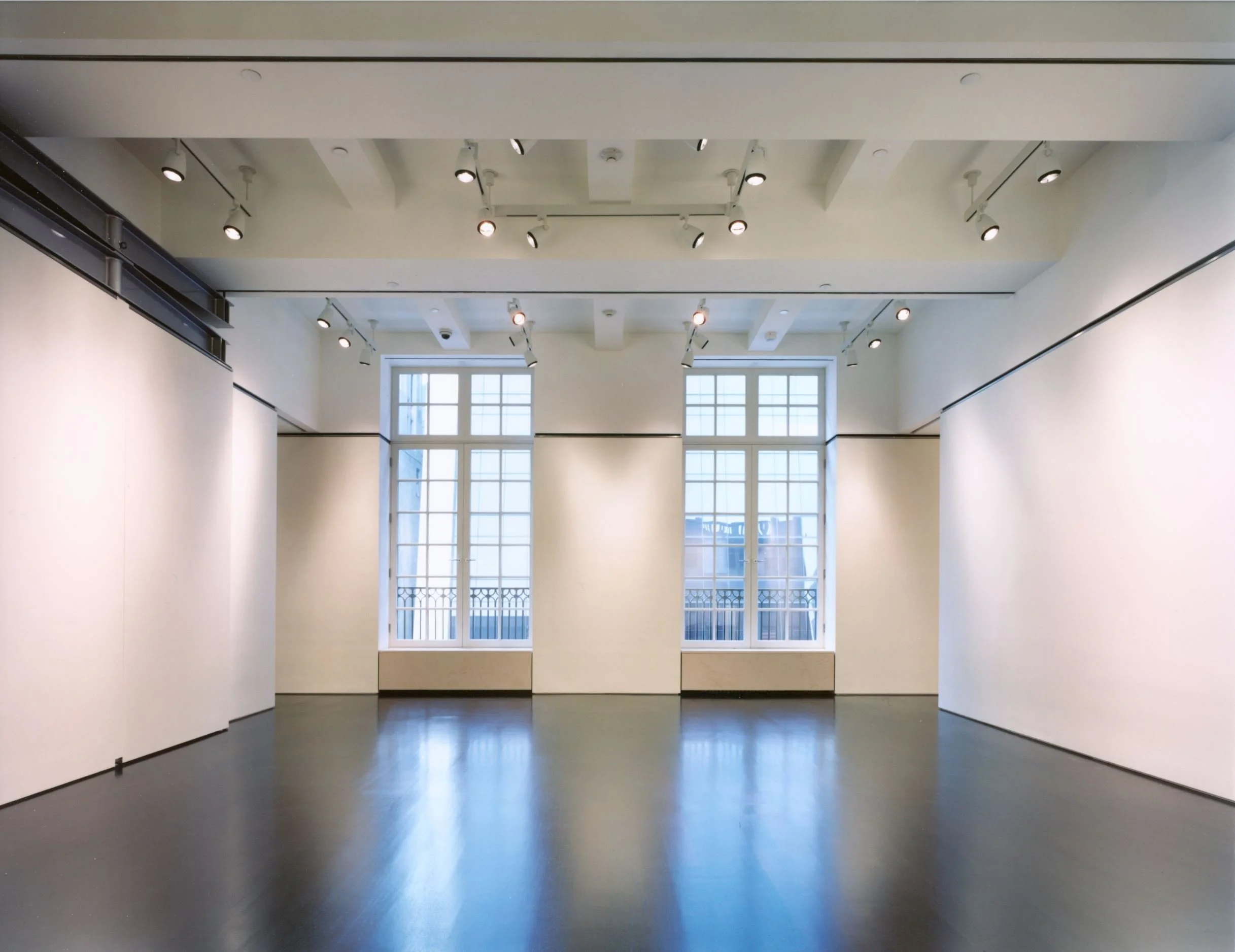 This private art gallery is designed to maximize art display with a custom designed art hanging system at the perimeter and an invented central display wall that moves laterally across the room as well as opens into as many as eight display panels. The dark wenge floors are contrasted by light lacquered walls with limestone benches and tables. The large French entry doors draw reference to the building windows.