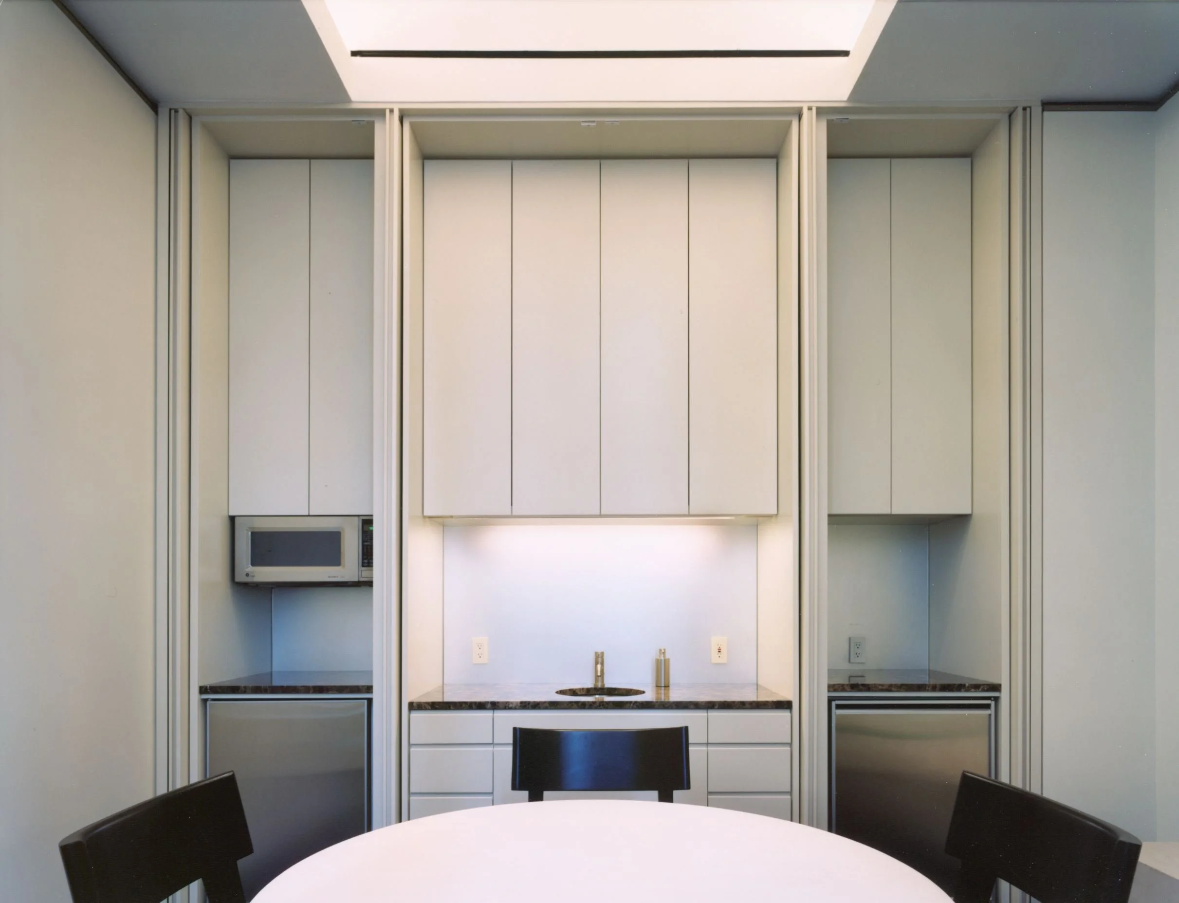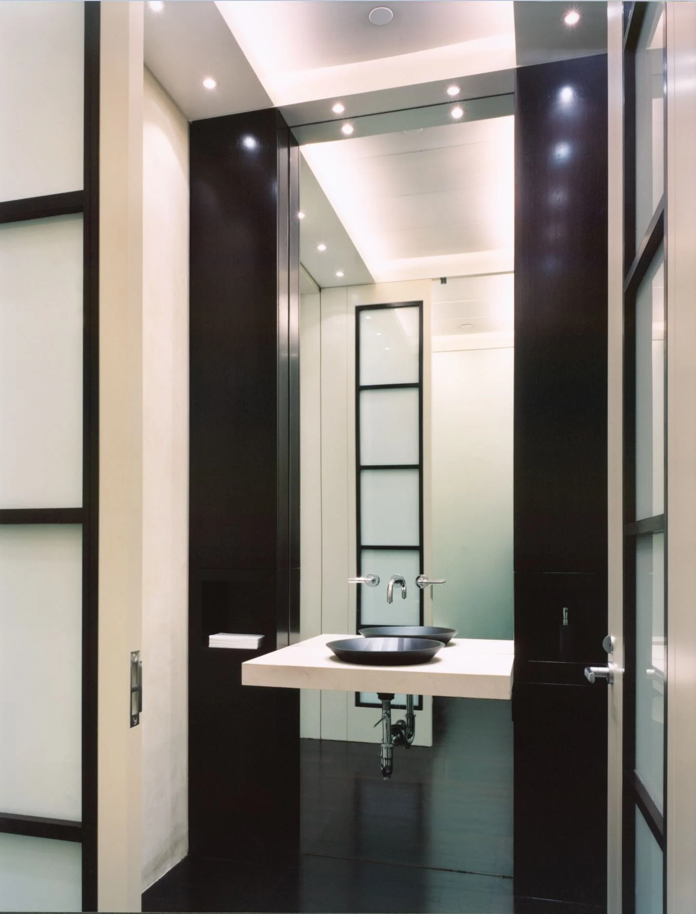 The pantry doubles as the deal closing room with lacquered sliding pivot pocket doors to enclose the pantry functions. The upscale finishes are brought to the guest restroom with a limestone counter and solid wenge sink. The entire experience is one of unexpected elegance.